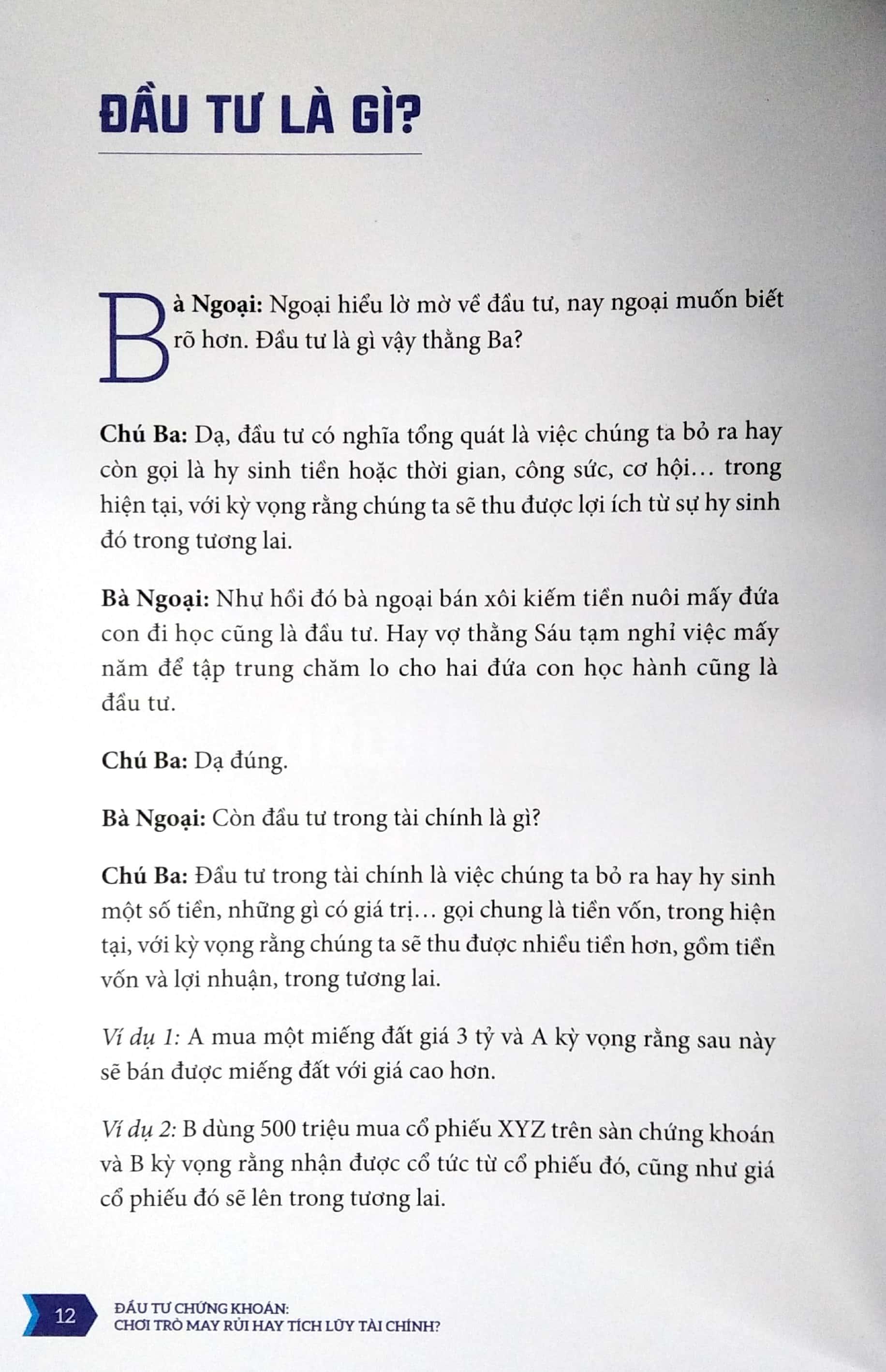 Cuốn sách “Đầu tư chứng khoán: Chơi trò may rủi hay tích lũy tài chính?” giúp cho độc giả hiểu rõ những kiến thức cơ bản về đầu tư: cách tính tỷ suất lợi nhuận, những rủi ro trong đầu tư chứng khoán, các công cụ đầu tư, sự khác nhau giữa giá và giá trị, các chiến lược đầu tư, và đặc biệt là sự khác biệt giữa đầu tư may rủi và đầu tư có phương pháp để tích lũy tài chính.
