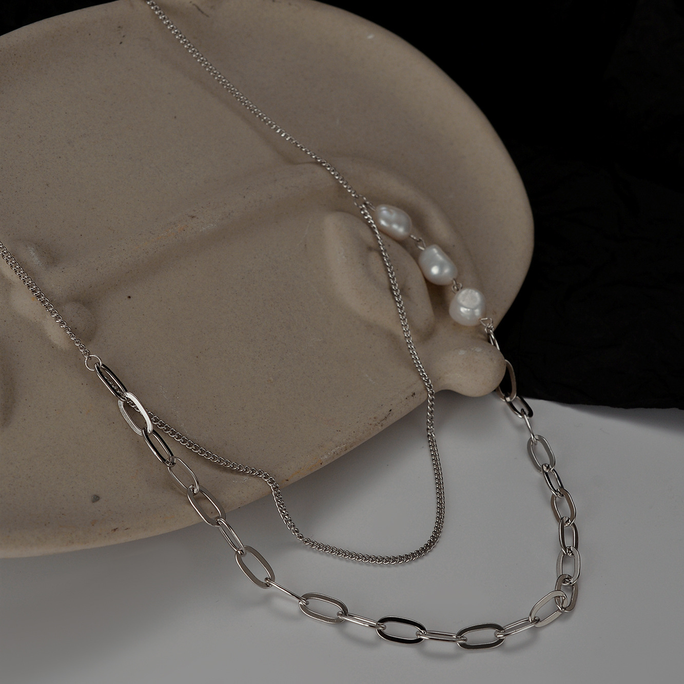 Dây chuyền vòng cổ titan hợp kim phối bất đối xứng hạt châu cá tính unisex nam và nữ