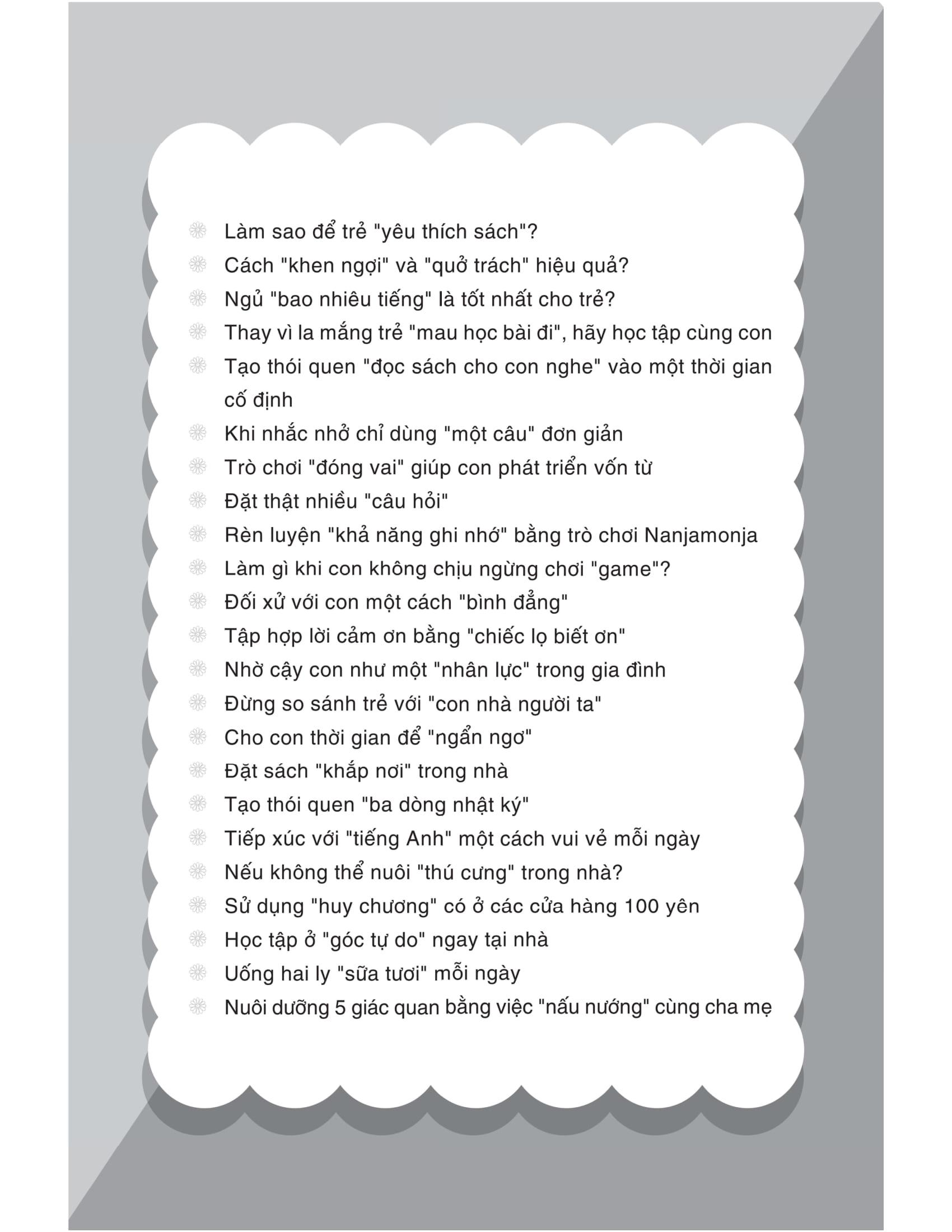 “Dạy con kỹ năng sống theo cách mẹ Nhật” tổng hợp những bí kíp mà bạn có thể thực hành ngay lập tức, giải đáp cụ thể cho câu hỏi: “Cha mẹ và những người lớn xung quanh trẻ nên làm gì?”