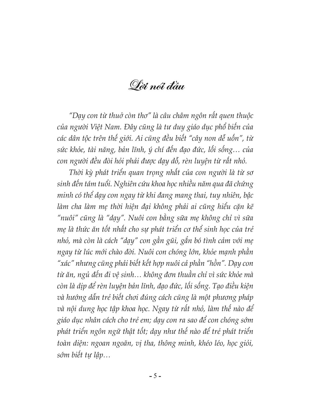 Mua tại TiktokSách chọn lọc và tập hợp những tri thức cơ bản về nuôi dạy con của nhiều chuyên gia tâm lý học, giáo dục học phương Đông, phương Tây, dành cho những bậc cha mẹ, nhất là những ông bố, bà mẹ trẻ: nuôi dạy con từ khi mới chào đời, dạy con từ ăn, ngủ đến đi vệ sinh, giáo dục nhân cách cho trẻ nhỏ, phát triển ngôn ngữ của trẻ em, cách dạy trẻ học tập từ nhỏ…