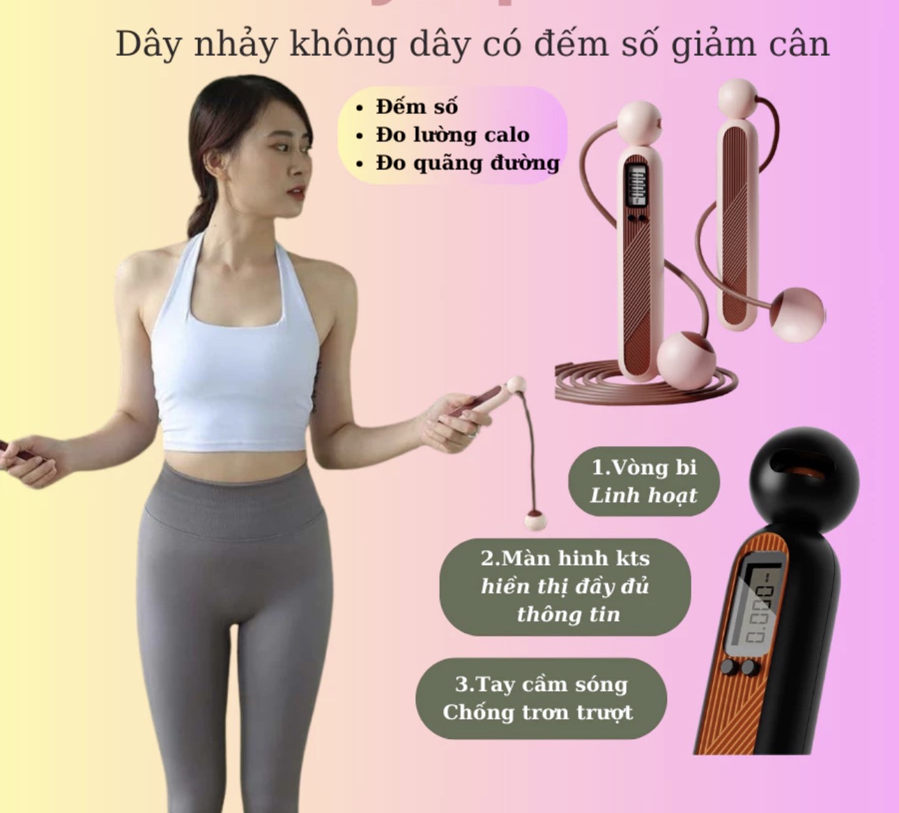 Mô Tả Sản Phầm: Dây nhảy không dây thể dục - Dây nhảy dây không dây đếm số giảm cân, dụng cụ thể thao đốt calo tại nhà hiệu quả Cải thiện khả năng phối hợp của cơ chân, giảm nguy cơ chân bị chấn thương. Tăng cường mật độ xương, cho bạn hệ thống xương khớp khỏe mạnh. Cải thiện sức khỏe của hệ tim mạch, phòng chống những bệnh lý liên quan đến tim mạch như đau tim, đột quỵ… Tăng hiệu quả hơi thở, tránh được tình trạng hụt hơi THÔNG TIN SẢN PHẨM