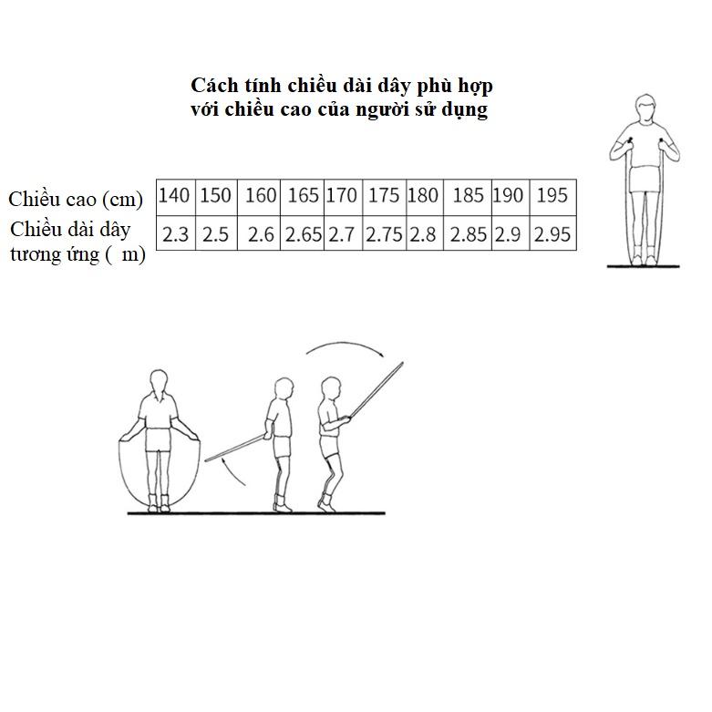 - Màu sắc: Đỏ, Xanh Lá, Xanh Dương, Xám Lưu ý: Có thể sử dụng cả trong phòng hoặc ngoài trời. Nên sử dụng với thảm tập, hạn chế tập trên đường mấp mô, lởm chởm, có sắc cạnh. Sử dụng nơi khô ráo, thoáng mát. Treo dây thẳng sau khi tập sẽ giúp dây bớt vặn xoắn, dễ dàng sử dụng lần sau. Thời gian bảo hành,1 tháng đổi mới trong vòng 15 ngày, nếu có lỗi của nhà sản xuất. CÂU HỎI THƯỜNG GẶP: 1️ Chọn các kích thước dây nhảy thế nào ? ● Thường cách đo hiệu quả nhất là đo dài dây lấy căn từ phần ngực tới chân. 2️ Nên chọn màu, chất liệu như thế nào? HỆ THỐNG dododiosCAM KẾT: