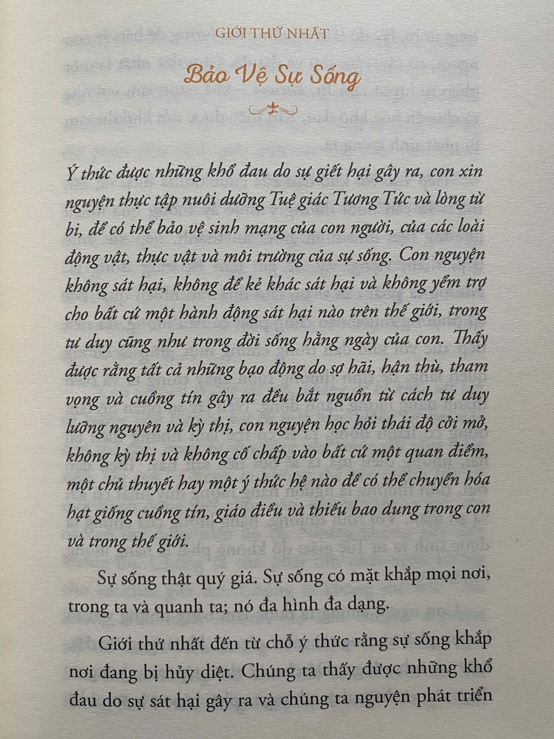 Học hỏi và thực tập theo Năm Giới và nương tựa Tam Bảo chắc chắn sẽ mang lại an lạc cho bản thân, cho cộng đồng và cho xã hội. Là con người, chúng ta cần có một cái gì để tin tưởng, một cái gì lành, đẹp và thật, một cái gì mà ta có thể tiếp xúc. Trong quyển sách này, Năm Giới được diễn bày theo hình thức mới, đó là Bảo vệ sự sống, Hạnh phúc chân thực, Tình thương đích thực, Ái ngữ và Lắng nghe, Nuôi dưỡng và trị liệu.