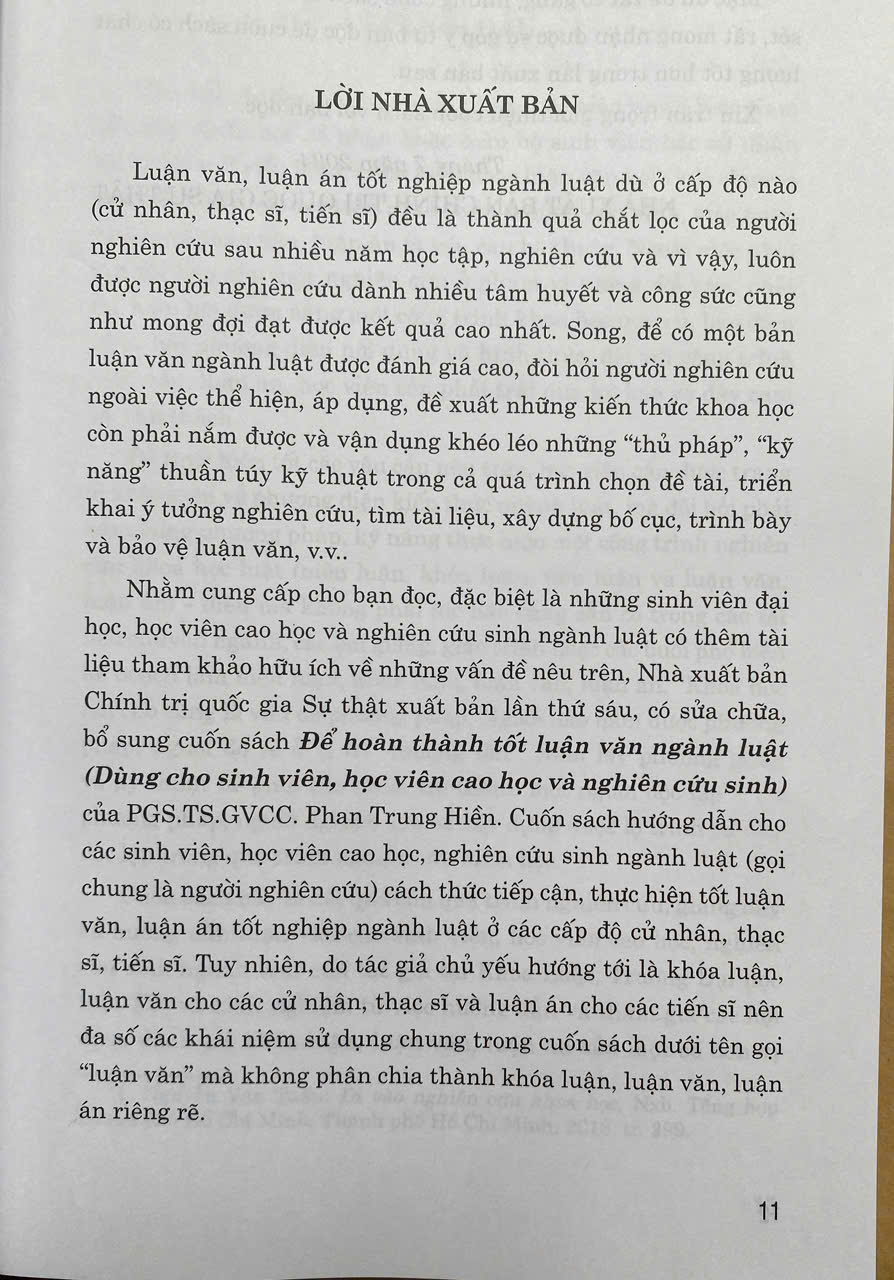 Nhằm cung cấp cho bạn đọc, đặc biệt là những sinh viên đại học, học viên cao học và nghiên cứu sinh ngành luật có một tài liệu tham khảo hữu ích về những vấn đề nêu trên, Nhà xuất bản Chính trị quốc gia Sự thật tái bản lần thứ sáu, có sửa chữa, bổ sung cuốn sách Để hoàn thành tốt luận văn ngành luật (Dùng cho sinh viên, học viên cao học và nghiên cứu sinh) của PGS.TS.GVCC. Phan Trung Hiền. Cuốn sách hướng dẫn cho các sinh viên, học viên cao học, nghiên cứu sinh ngành luật (gọi chung là người nghiên cứu, cách thức tiếp cận, thực hiện tốt luận văn, luận án tốt nghiệp ngành luật ở các cấp độ cử nhân, thạc sĩ, tiến sĩ. Tuy nhiên, do đối tượng cơ bản tác giả hướng tới là khóa luận, luận văn cho các cử nhân, thạc sĩ và luận án cho các tiến sĩ nên đa số các khái niệm sử dụng chung trong cuốn sách dưới tên gọi “luận văn” mà không phân chia thành khóa luận, luận văn, luận án riêng rẽ.