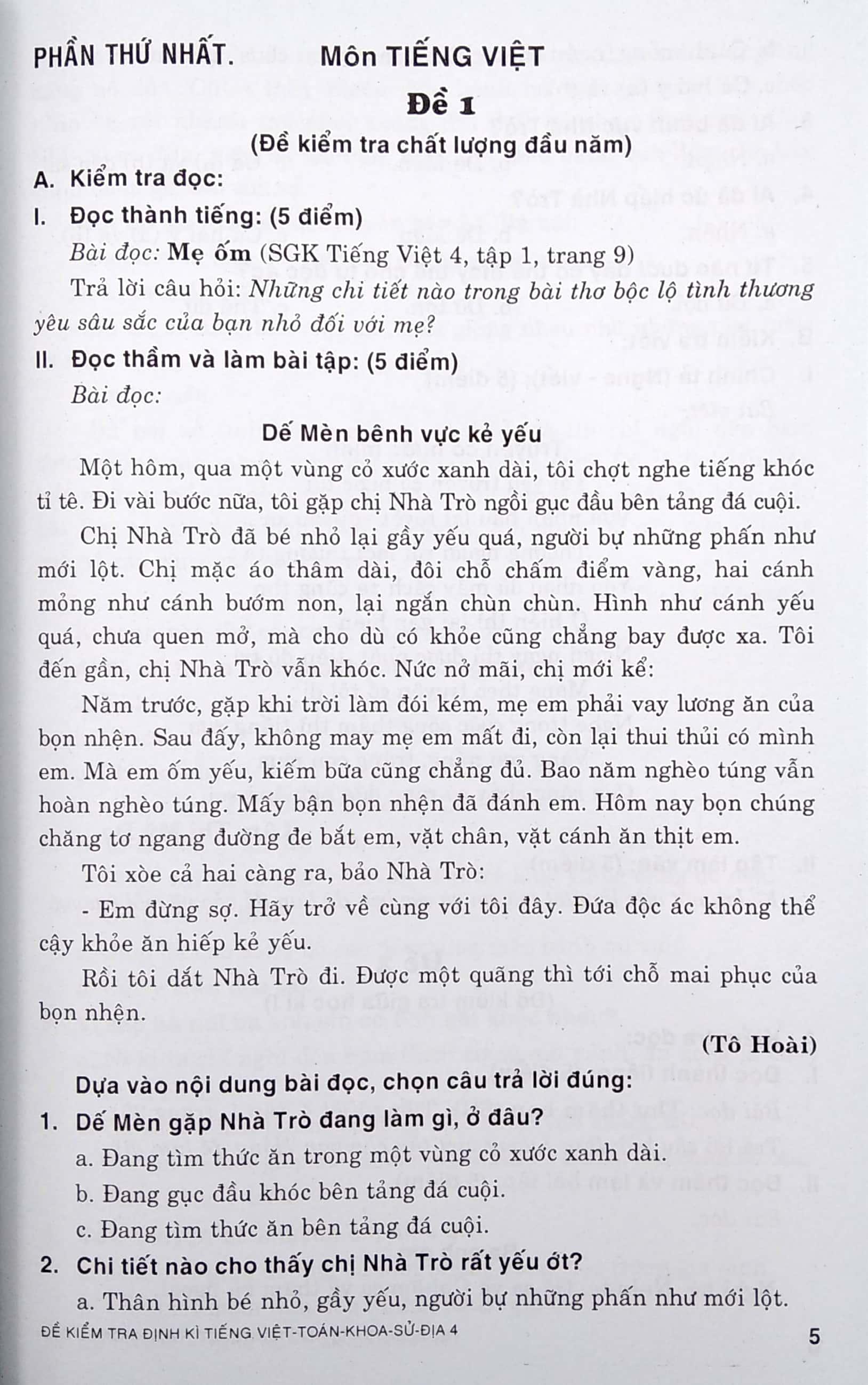 Mua tại TiktokLớp 4 cấp tiểu học, các em được tiếp nhận một chương trình học đa dạng và phong phú. Học tốt các môn học ở lớp 4, giúp các em có nền tảng vững chắc cho việc học tập ở các lớp trên. Để giúp các em có tài liệu ôn tập, củng cố kiến thức đã học và chuẩn bị tốt cho các đợt kiểm tra định kì, chúng tôi xin giới thiệu quyển sách: Đề Kiểm Tra Định Kỳ Tiếng Việt -Toán - Khoa Học - Lịch Sử - Địa Lý Lớp 4.