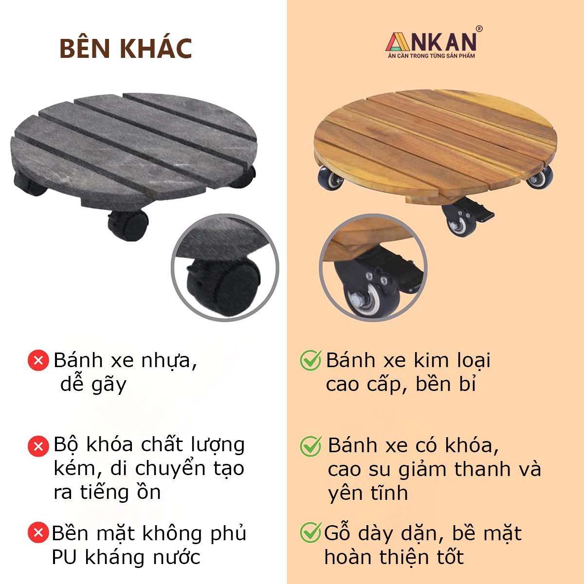 ƯU ĐIỂM ĐẾ LÓT CHẬU CÂY CÓ BÁNH XE ANKAN ★ Gỗ tràm bông vàng được chọn từ gỗ nguyên, gỗ mới, ít mắt gỗ và được gia công tỉ mĩ, ít trầy xướt. ★ Xử lý 2