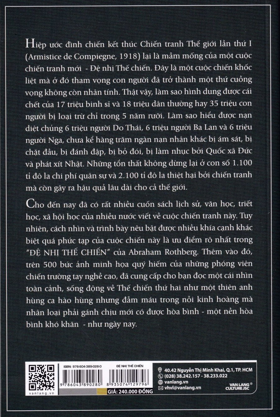 Cho đến nay đã có rất nhiều cuốn sách lịch sử, văn học, triết học, xã hội học của nhiều nước viết về cuộc chiến tranh này. Tuy nhiên, cách nhìn và trình bày nêu bật được nhiều khía cạnh khác biệt quá phức tạp của cuộc chiến này là ưu điểm rõ nhất trong cuốn sách World Warr II - Đệ Nhị Thế Chiến của Abraham Rothberg. Thêm vào đó, trên 500 bức ảnh minh họa quý hiếm của những phóng viên chiến trường tay nghề cao đã cung cấp cho bạn đọc một cái nhìn toàn cảnh, sống động về Thế chiến thứ hai như một thiên anh hùng ca hào hùng nhưng đẫm máu trong nỗi kinh hoàng mà nhân loại phải gánh chịu mới có được hòa bình - một nền hòa bình khó khăn - như ngày nay.