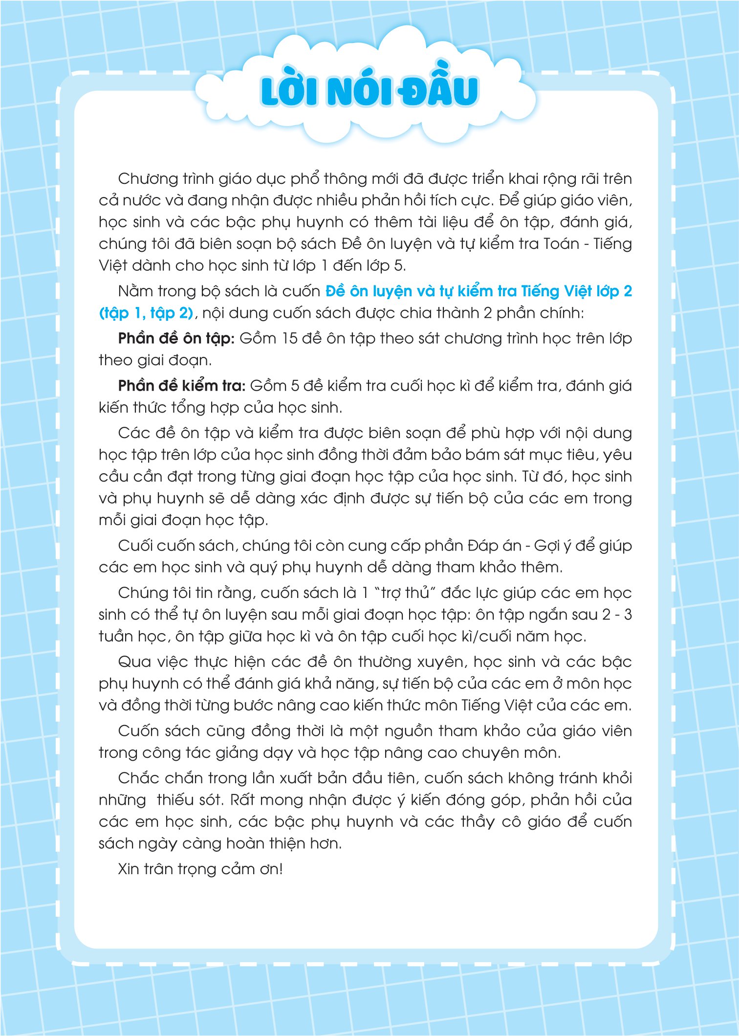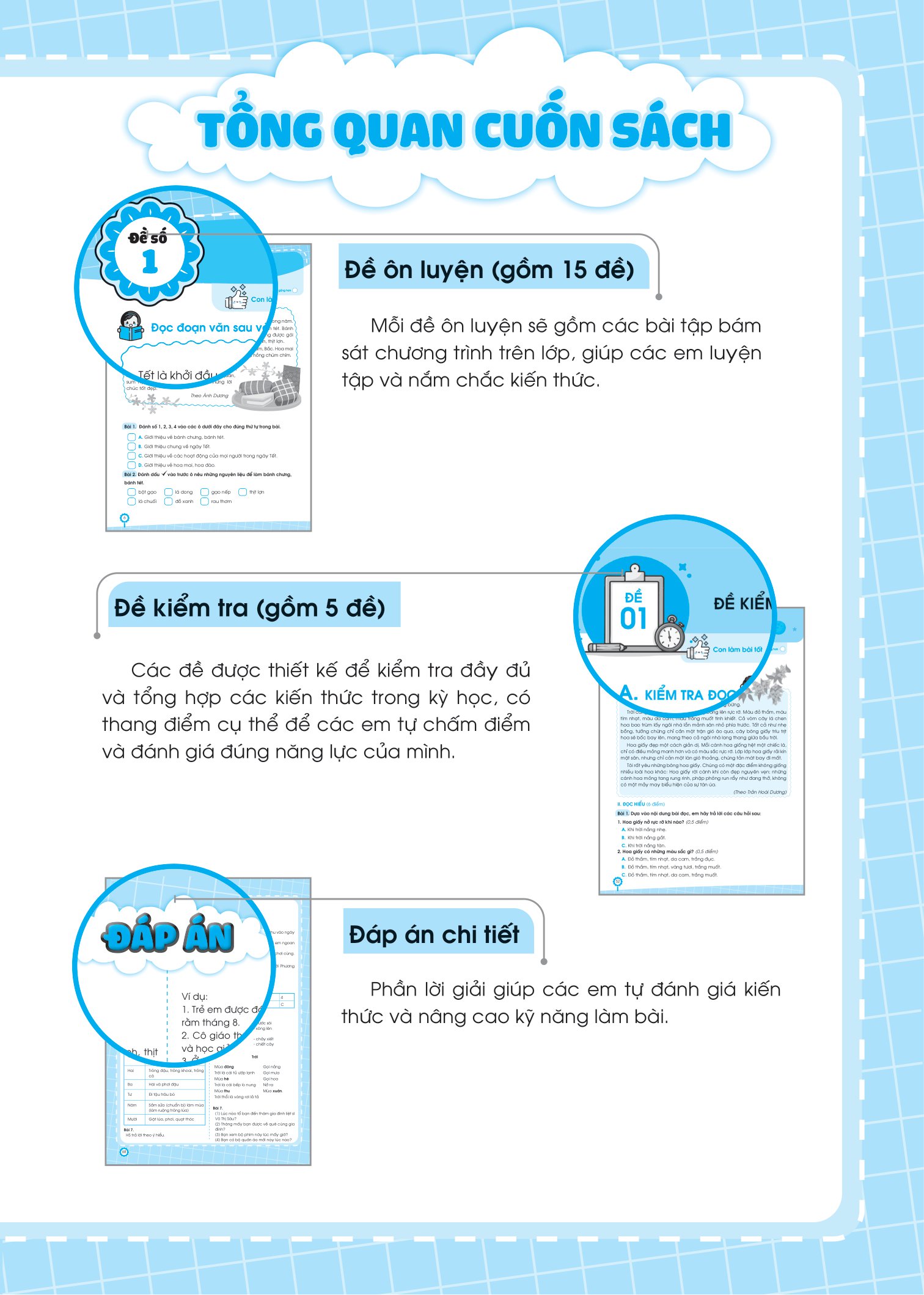 - Sách được chia thành 2 phần rất dễ hiểu cho các bé: Phần đề ôn tập và Phần đề kiểm tra. Phần đề ôn tập: Gồm 15 đề được chia theo các chủ điểm, hoặc chia thành các đề ôn tập theo sát chương trình học trên lớp theo giai đoạn. Phần đề kiểm tra: Gồm 5 đề kiểm tra cuối học kỳ để kiểm tra, đánh giá kiến thức tổng hợp của học sinh.