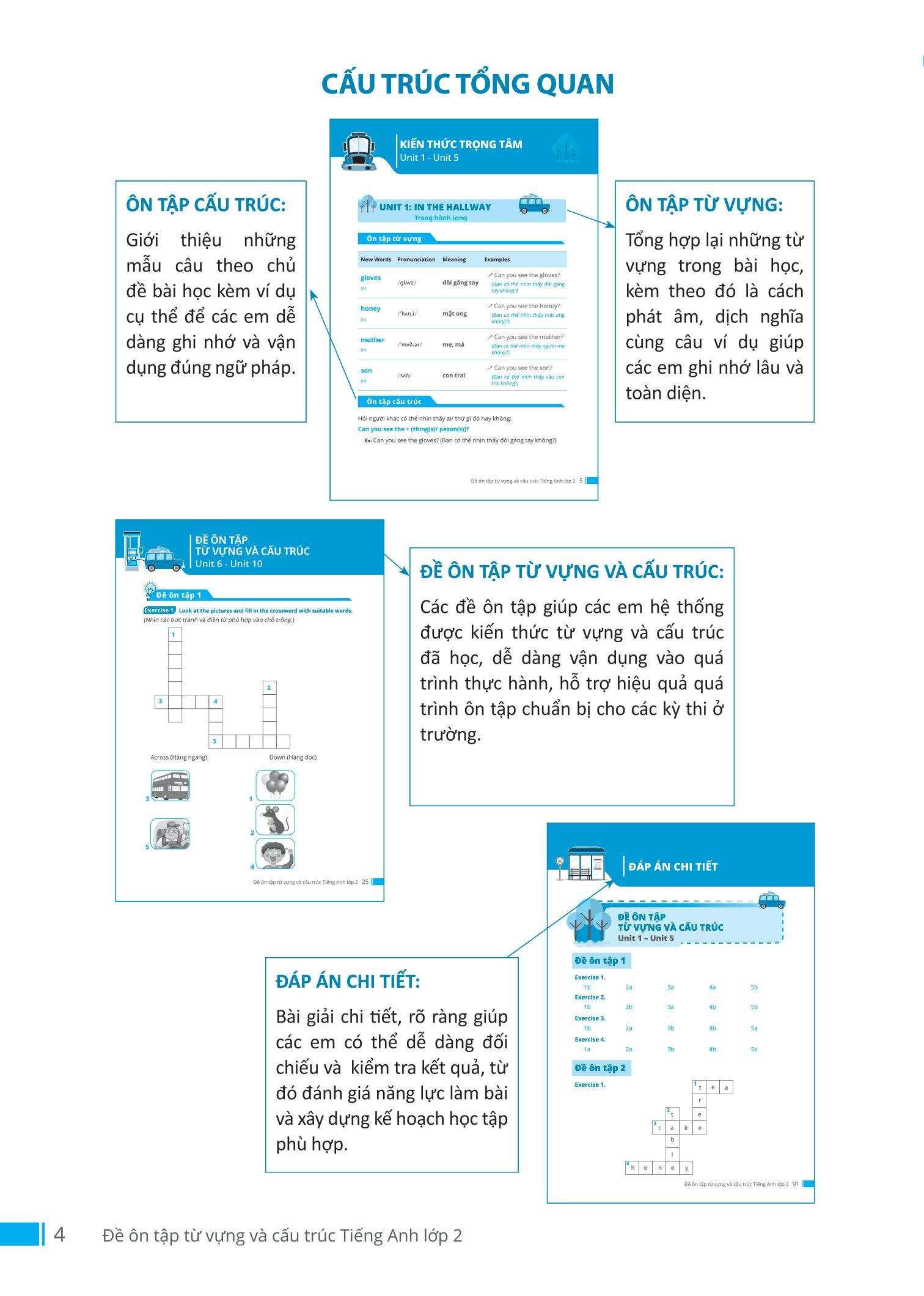 - Sách tổng hợp kiến thức trọng tâm về cả cấu trúc và từ vựng ÔN TẬP CẤU TRÚC: Giới thiệu những mẫu câu theo chủ đề bài học kèm ví dụ cụ thể để các em dễ dàng ghi nhớ và vận dụng đúng ngữ pháp. ÔN TẬP TỪ VỰNG: Tổng hợp lại những từ vựng trong bài học, kèm theo đó là cách phát âm, dịch nghĩa cùng câu ví dụ giúp các em ghi nhớ lâu và toàn diện.