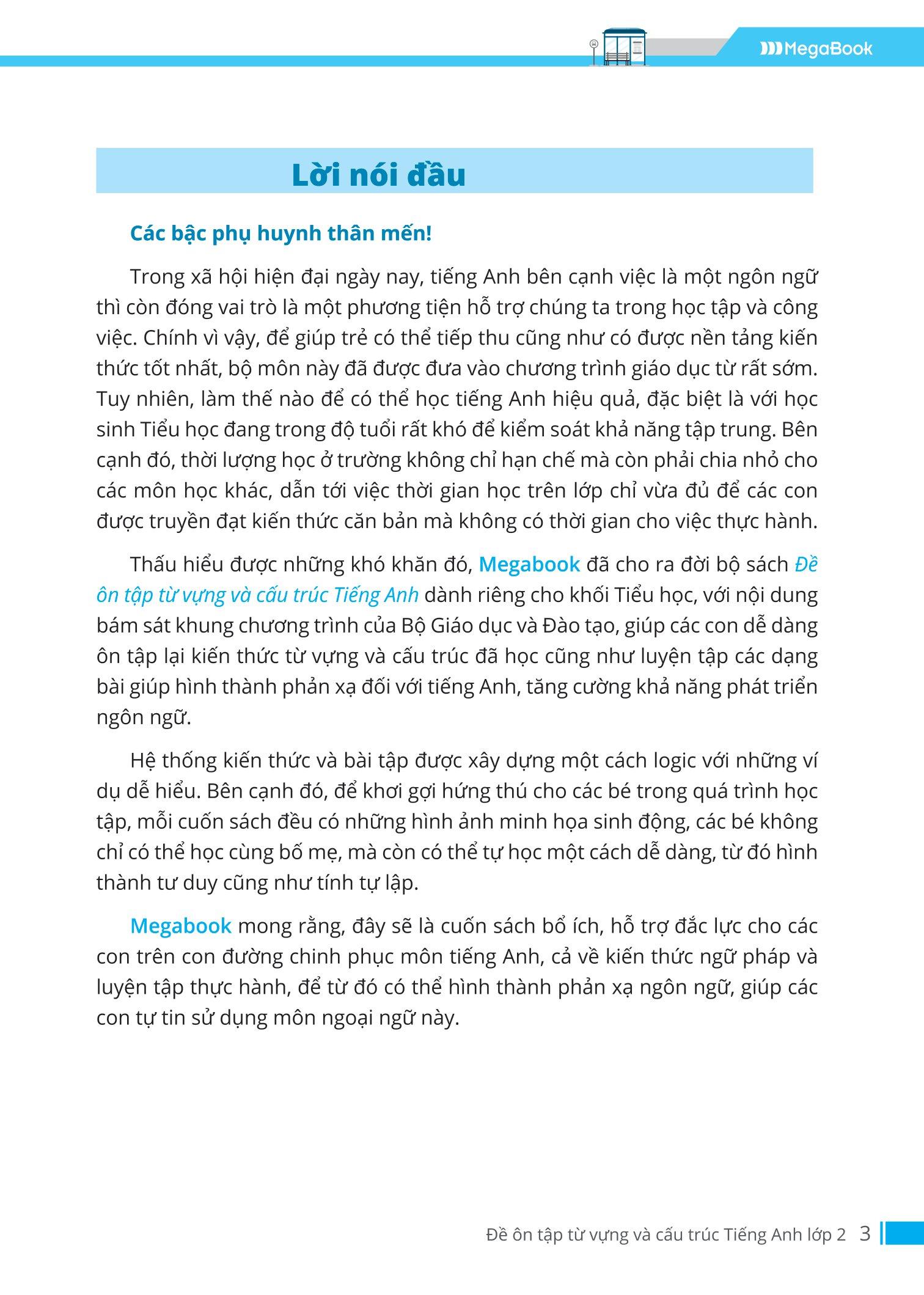 - Lời giải và đáp án chi tiết, rõ ràng Lời giải chi tiết, rõ ràng giúp các em có thể dễ dàng đối chiếu và kiểm tra kết quả, từ đó đánh giá năng lực làm bài và xây dựng kế hoạch học tập phù hợp. Megabook mong rằng, đây sẽ là cuốn sách bổ ích, hỗ trợ đắc lực cho các con trên con đường chinh phục môn tiếng Anh, cả về kiến thức ngữ pháp và luyện tập thực hành, để từ đó có thể hình thành phản xạ ngôn ngữ, giúp các con tự tin sử dụng môn ngoại ngữ này.