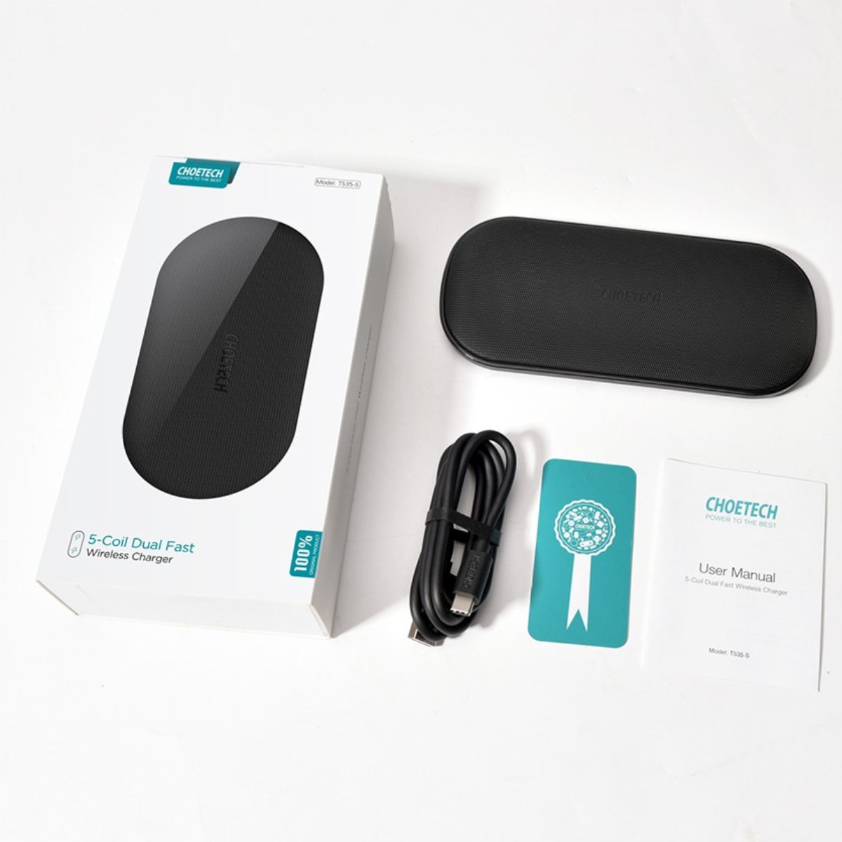 - Đóng gói: Hộp 1 sản phẩm, 1 cáp USB to Type C và sách hướng dẫn sử dụng Thông tin chi tiết – Với những người dùng yêu thích sự tiện dụng thì một chiếc đế sạc không dây như Choetech T535 chắc hẳn sẽ là phụ kiện không thể thiếu trên bàn làm việc. Bên cạnh thiết kế mỏng gọn, đế sạc còn nổi bật với cấu trúc sạc kép, có thể sạc cùng lúc 2 thiết bị điện tử, hỗ trợ công suất sạc lên đến 10W. – Tương tự như các mẫu sạc không dây khác trên thị trường, Choetech T535 mang đến một phương thức sạc hiện đại, tiện lợi hơn, nhưng vẫn đảm bảo khả năng sạc ổn định, bảo vệ tốt cho thiết bị. Bên cạnh thiết kế nhỏ gọn, đế sạc không dây này còn hỗ trợ công suất sạc lên đến 10W, giúp rút ngắn đáng kể thời gian sạc so với củ sạc thông thường. Ngoài ra, kết cấu sạc kép, có thể sạc cùng lúc cho 2 thiết bị cũng chính là ưu điểm nổi bật nhất của của chiếc đế sạc không dây này. – Không chỉ nhỏ gọn, đế sạc không dây Choetech T535 còn sở hữu thiết kế siêu mỏng với độ hoàn thiện khá tốt. Ngoại hình thon gọn với kiểu dáng oval, được bo tròn các cạnh tinh tế. Bề mặt được gia công từ vật liệu ABS + PC chống cháy, cho độ bền cao, cùng khả năng chịu nhiệt tốt. Do đó, người dùng có thể yên tâm sạc trong nhiều giờ mà không lo nóng. – So với thiết bị cùng loại khác, đó chính là khả năng sạc không dây chuẩn Qi, hỗ trợ công suất sạc kép 5W/ 7.5W và 10W. Nhờ sở hữu thiết kế này, đế sạc có thể cung cấp năng lượng cùng lúc cả 2 thiết bị di động với dòng sạc nhanh, ổn định nhưng vẫn đảm bảo an toàn khi sử dụng. – Sản phẩm không chỉ tương thích với smartphone có hỗ trợ sạc không dây, mà nó còn có thể được dùng để sạc pin cho các dòng tai nghe TWS, giúp tiết kiệm và rút ngắn tối đa thời gian sạc. – Đế sạc không dây Choetech T535 cũng được trang bị đầy đủ các tính năng bảo vệ như: quá dòng, quá áp, quá tải, và quá nhiệt,… đảm bảo an toàn cho các thiết bị sạc. Do đó, người dùng hoàn toàn có thể yên tâm sử dụng mà không cần phải lo lắng về tuổi thọ pin. – Lưu ý: Khi dùng đế sạc nhanh không dây bạn cần sử dụng bộ sạc QC3.0 của riêng bạn Hình ảnh Đế sạc Choetech T535 không dây 2 in 1 công suất 10w (Hàng chính hãng) Đế sạc Choetech T535 không dây 2 in 1 công suất 10w (Hàng chính hãng)