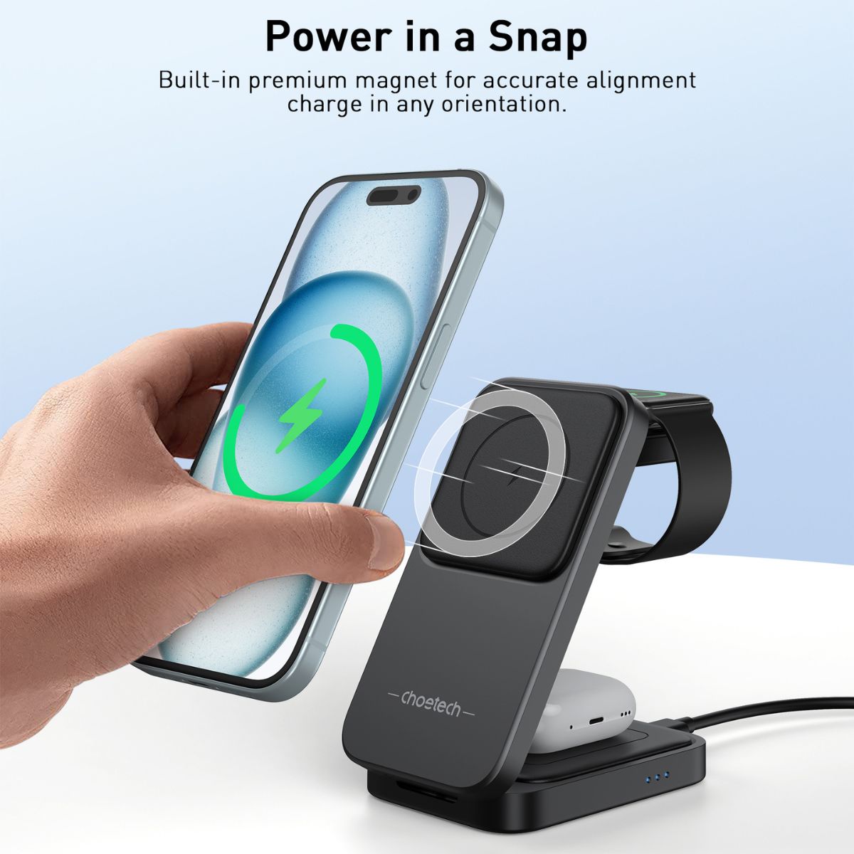 Đế sạc Choetech T611 Mag-safe 3 in 1 xếp gọn 15W dùng sạc cho điện thoại, tai nghe và Ap-ple watch (Hàng chính hãng)