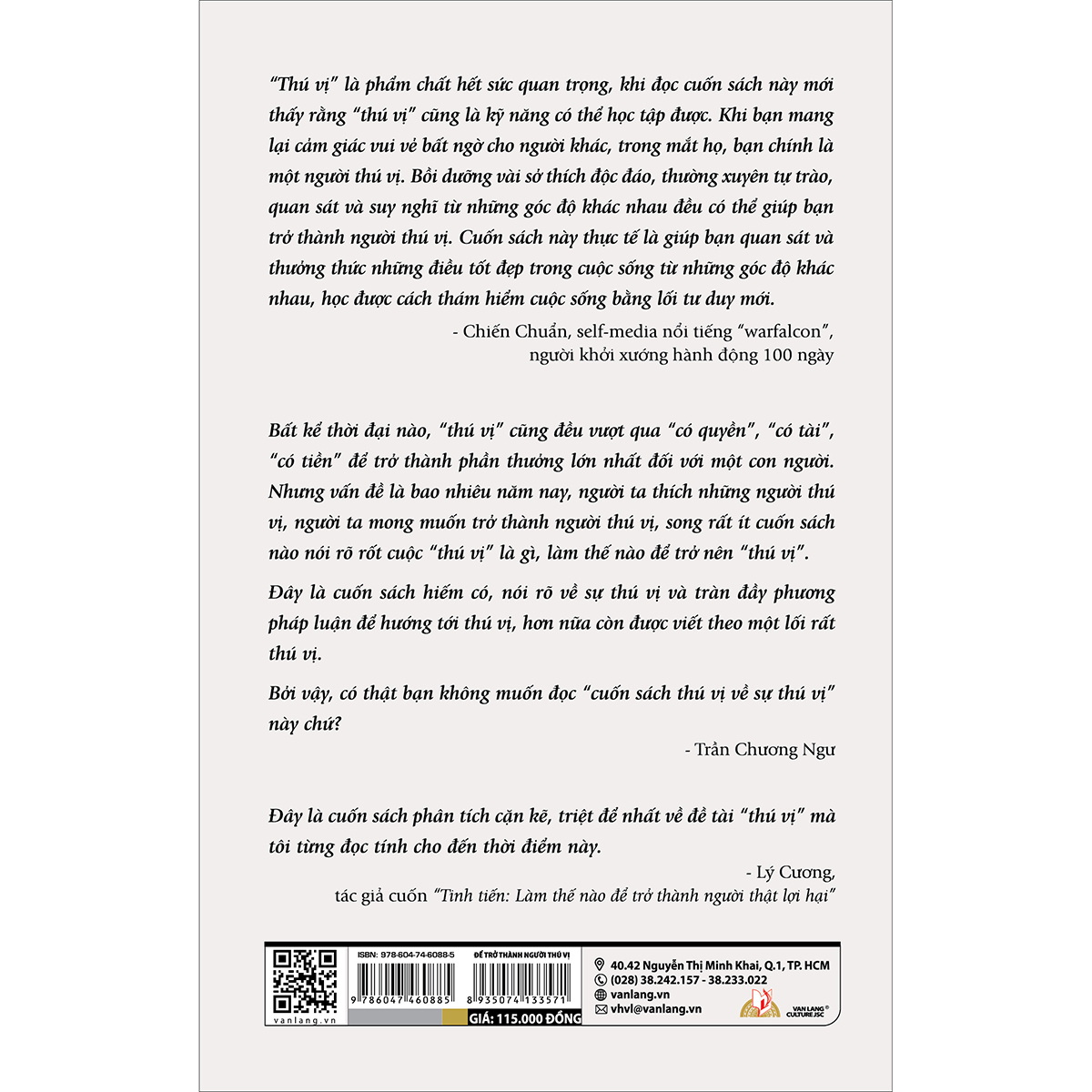 Bất kể thời đại nào, “thú vị” cũng đều vượt qua “có quyền”, “có tài”, “có tiền” để trở thành phần thưởng lớn nhất đối với một con người. Nhưng vấn đề là bao nhiêu năm nay, người ta thích những người thú vị, người ta mong muốn trở thành người thú vị, song rất ít cuốn sách nào nói rõ rốt cuộc “thú vị” là gì, làm thế nào để trở nên “thú vị”.
