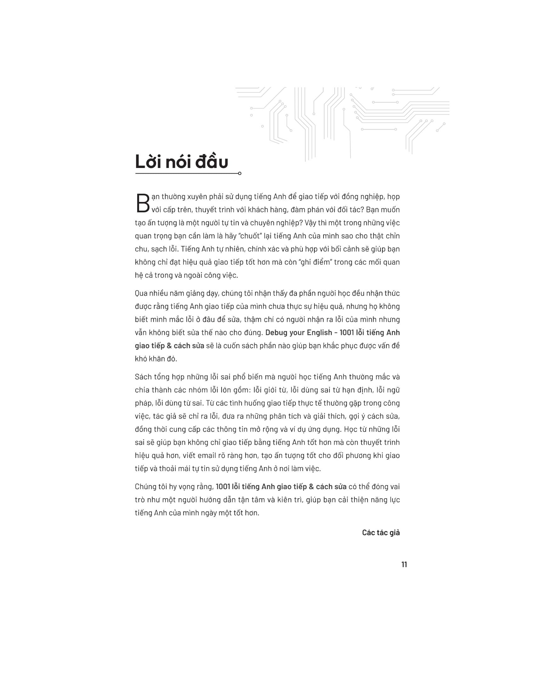 1001 lỗi tiếng Anh giao tiếp & cách sửa – Debug your English là cuốn sách tổng hợp các lỗi sai phổ biến mà người học tiếng Anh thường mắc và chia thành các nhóm lỗi lớn như lỗi dùng sai giới từ, lỗi ngữ pháp, lỗi dùng từ, lỗi diễn đạt thiếu tự nhiên. Từ các tình huống giao tiếp thực tế trong công việc, sách chỉ ra các lỗi sai và đề xuất cách sửa, giải thích sắc thái của từ, đồng thời cung cấp thông tin mở rộng và ví dụ ứng dụng.