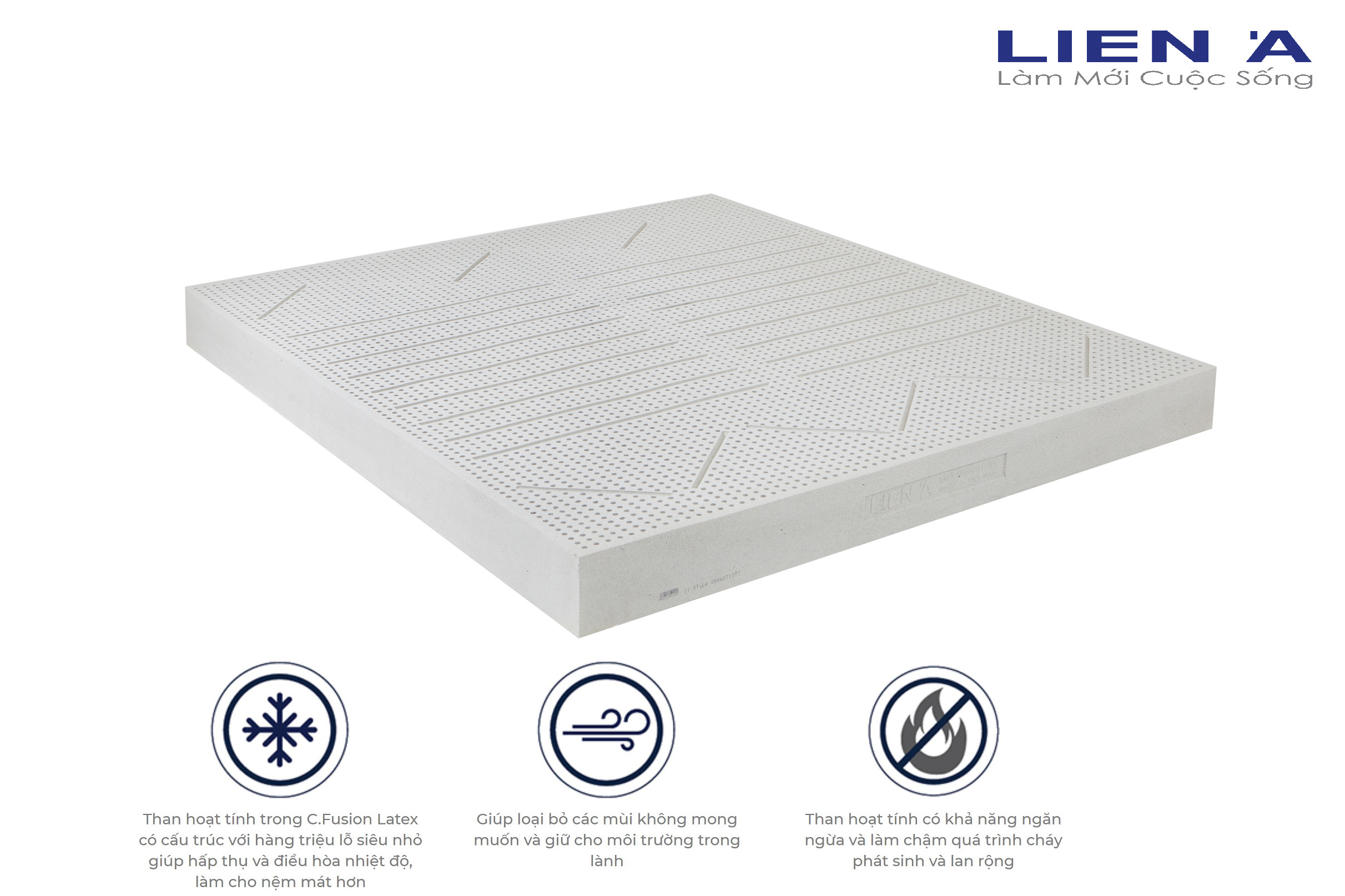 Lần đầu tiên hai nguyên liệu cao su thiên nhiên và than hoạt tính được kết hợp thành công để tạo ra chất liệu mới mang đủ đặc tính ưu việt của cả hai loại nguyên liệu. Công nghệ C.FUSION LATEX của Liên Á đã mở ra xu hướng phát triển những dòng nệm kháng khuẩn bảo vệ sức khỏe người dùng.