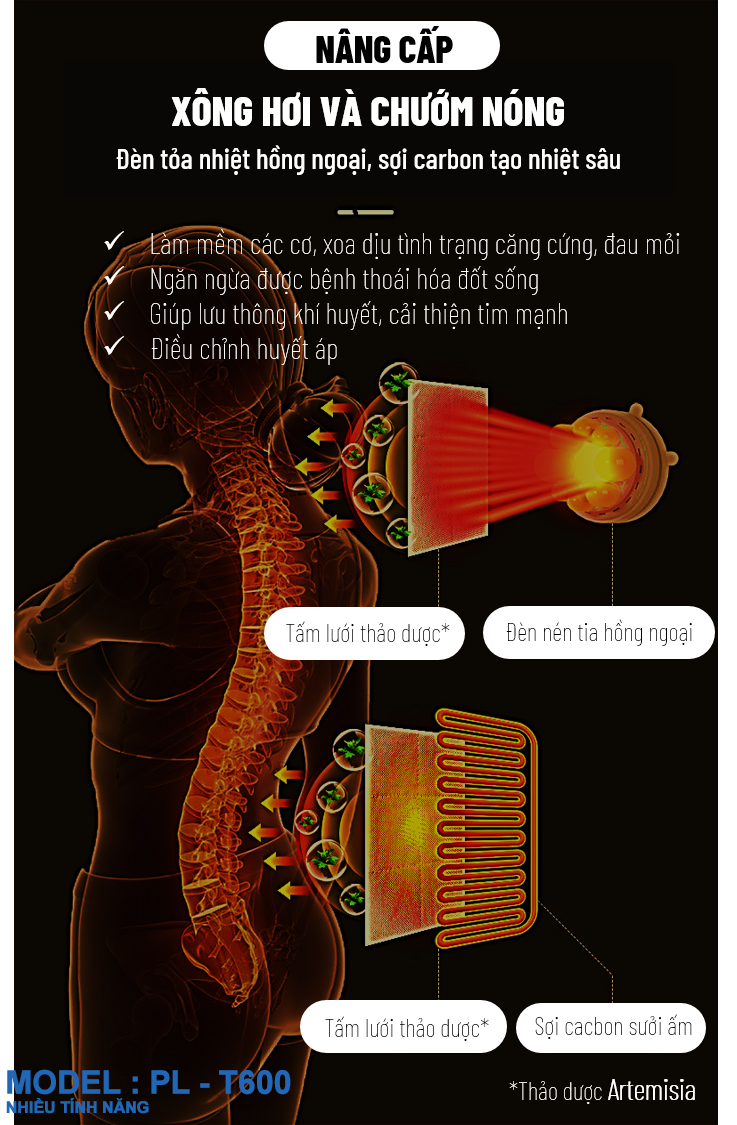 • Massage dạng sóng: Massage mặt sau của nệm và sử dụng massage rung dạng sóng để thư giãn lưng. Đầu massage có chức năng sưởi ấm riêng, có thể làm giảm các cơ cứng và giảm mệt mỏi.'