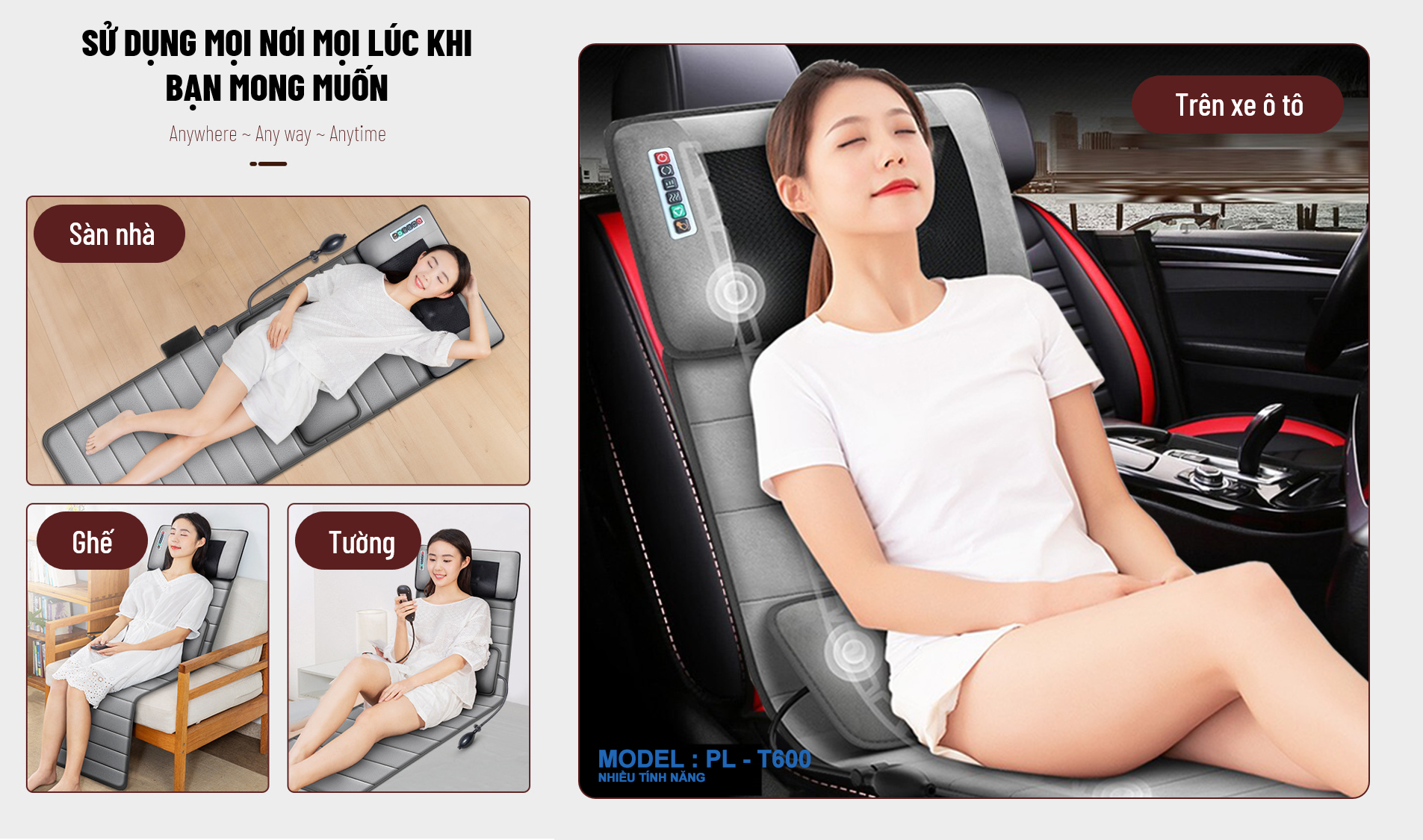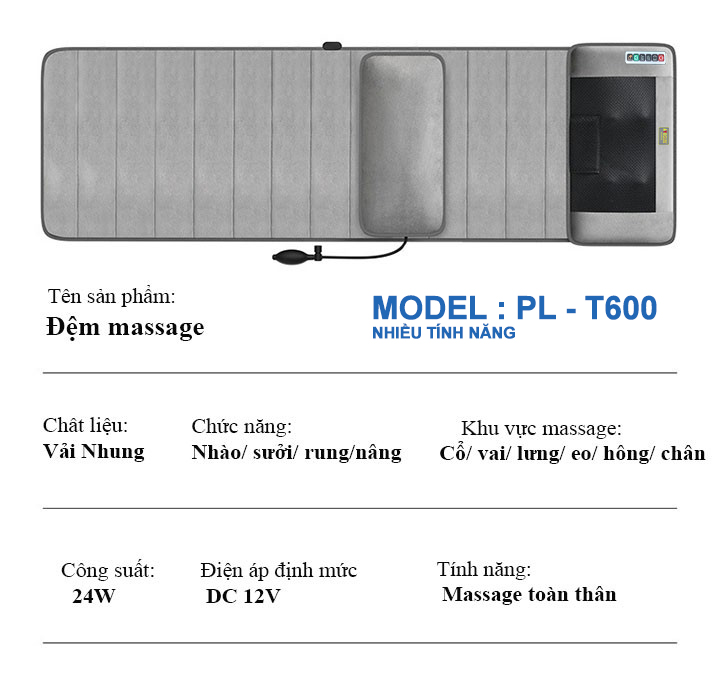 Giới thiệu nệm massage toàn thân aYosun PL - T600 - đệm massage toàn thân, rung xoa bóp nhào nặn có chế độ nhiệt hồng ngoại Đặc điểm nổi bật: nệm massage toàn thân