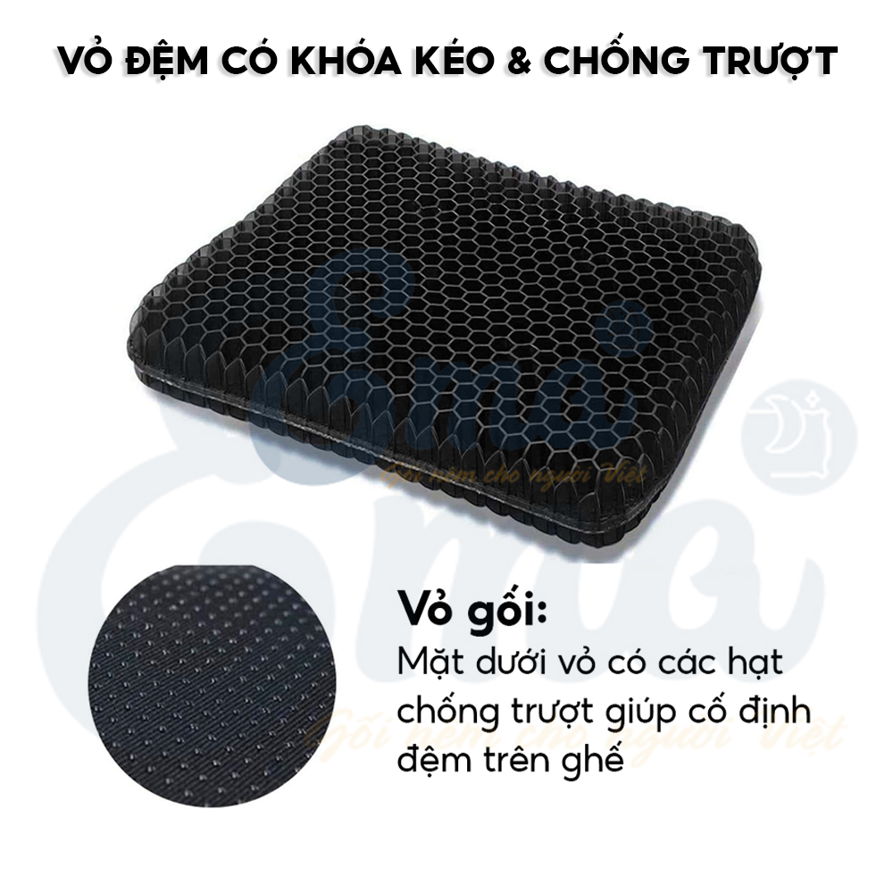 - Chất liệu cao cấp: ruột đệm được làm từ Gel Silicon cao cấp, mật độ phân tử lớn (khối lượng lên đến 1000g), độ bền cao, vỏ đệm được làm từ cotton lỗ, mặt dưới có lớp chống trượt