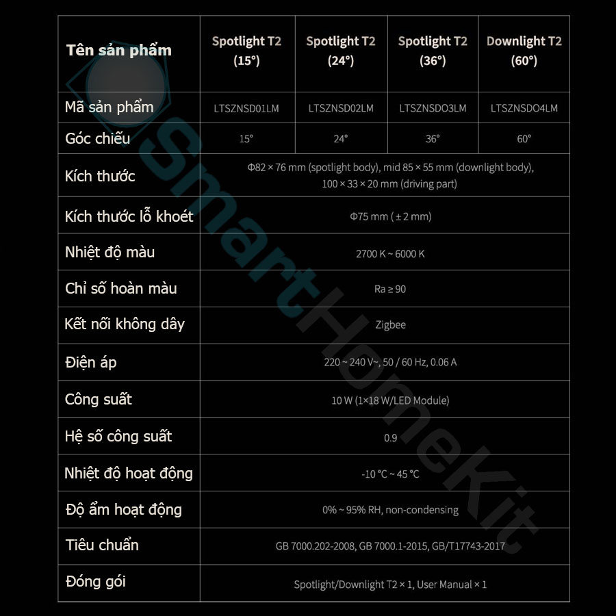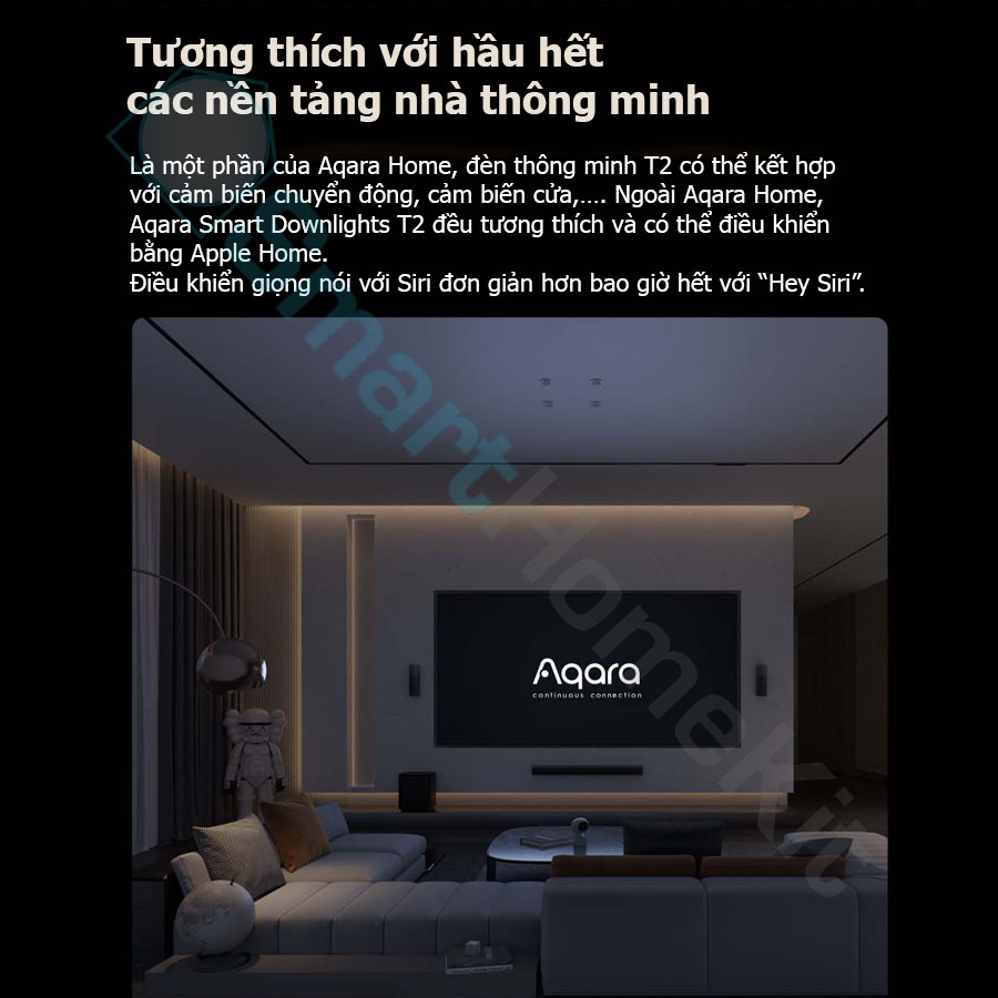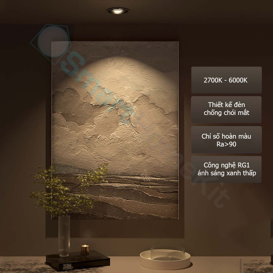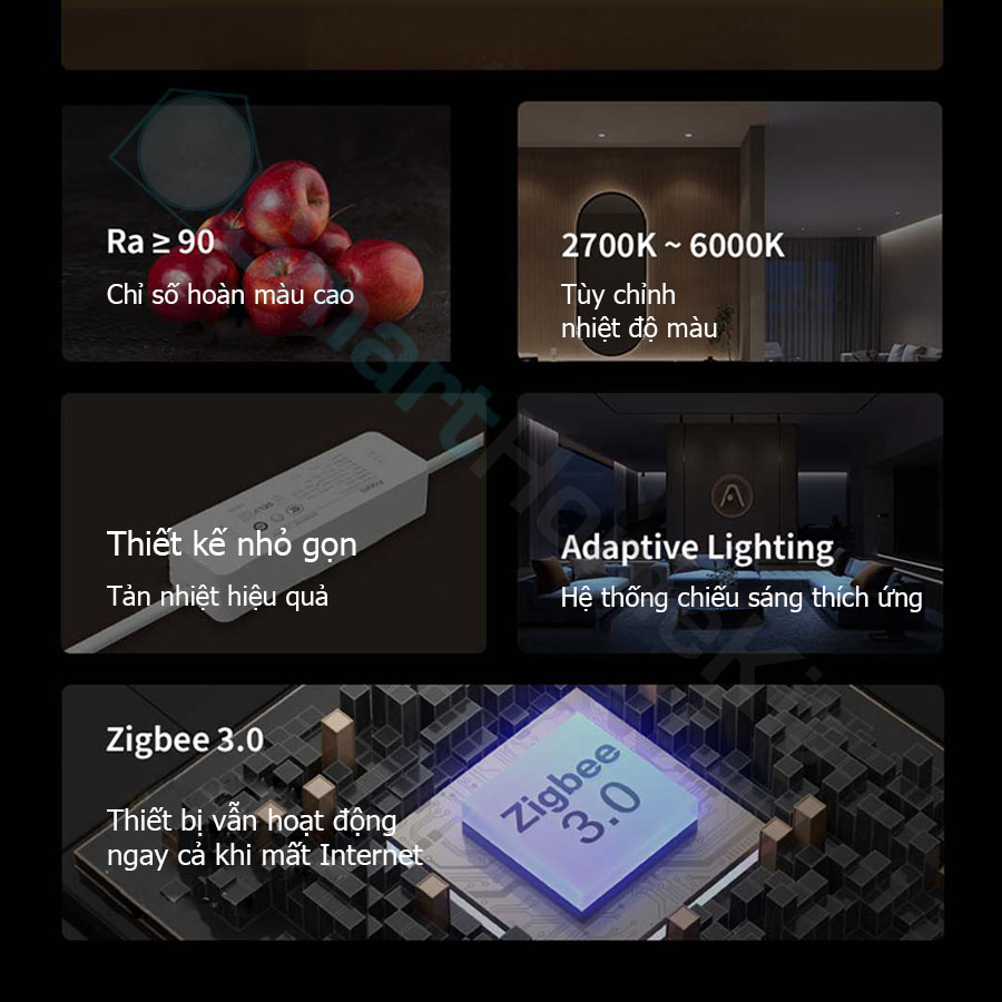 - Lỗ khoét cut out 75mm Đèn LED âm trần tinh xảo, nguồn sáng chất lượng cao Đèn âm trần thông minh Aqara Downlight T2 sẽ mang tới nguồn ánh sáng chất lượng cao cho căn nhà của bạn. Với hệ thống chiếu sáng LED cao cấp đảm bảo mang lại sự tinh tế cho không gian trong ngôi nhà bạn. Với mô-đun LED có chỉ số hoàn màu chính xác và công nghệ điều chỉnh độ sáng sâu, ánh sáng trong nhà bạn chưa bao giờ đẹp đến thế. Với sự hỗ trợ Zigbee 3.0, đèn được tích hợp vào của bạn và tương thích với Apple HomeKit. Bạn sẽ có các tùy chọn tùy chỉnh gần như vô hạn. Giảm và tăng độ sáng đèn một cách dễ dàng hoặc điều chỉnh nhiệt độ màu dựa trên tâm trạng hoặc thời gian trong ngày của bạn. Điều khiển đèn bằng một chạm đơn giản trê điện thoại, tích hợp với scene, kết hợp cùng các cảm biến Aqara… *Yêu cầu có Thay đổi độ sáng và nhiệt độ màu tùy ý Đèn Aqara Downlights T2 có thể giảm và tăng độ sáng và thay đổi nhiệt độ màu từ 2700K (trắng ấm) đến 6000K (trắng mát). Với công nghệ làm mờ sâu, Aqara Downlights T2 có thể làm mờ đến mức ánh sáng dịu gần như không thể nhận ra ở độ sáng 1%, và sáng tới công suất cao nhất là 10W. hay đổi đèn của bạn từ mát sang ấm một cách đơn giản – đèn ấm áp có màu vàng hơn và đẹp hơn vào buổi sáng sớm, buổi tối và đêm. Ánh đèn mát mẻ gợi nhớ nhiều hơn đến màu sắc của mặt trời vào buổi trưa – xanh lam và hoàn hảo để giúp bạn tập trung trong ngày. Tự động hóa đèn của bạn một cách dễ dàng dựa trên bộ kích hoạt cảm biến hoặc thời gian trong ngày. Điều khiển từng đèn riêng lẻ hoặc một nhóm đèn cùng lúc thời theo độ sáng và nhiệt độ màu mà bạn đã đặt. Ví dụ: Vào buổi tối có thể làm mờ hầu hết các đèn của bạn xuống 50%, điều chỉnh chúng sang tông màu ấm hơn. Tương thích với hầu hết các nền tảng nhà thông minh Là một phần của Aqara Home, đèn thông minh T2 có thể kết hợp với , ,…. Ví dụ: đèn tự động sáng khi có chuyển động vào buổi tối. Ngoài Aqara Home, Aqara Smart Downlights T2 đều tương thích và có thể điều khiển bằng Apple Home. Điều khiển giọng nói với Siri đơn giản hơn bao giờ hết. Các câu lệnh đơn giản chỉ cần bắt đầu với “Hey Siri” Hệ thống chiếu sáng thích ứng Apple HomeKit Adaptive Lighting Trải nghiệm sự tích hợp liền mạch ánh sáng của công nghệ của Apple. Bằng cách bật tính năng này trong ứng dụng Apple Home, đèn trần sẽ tự động điều chỉnh nhiệt độ màu dựa trên thời gian trong ngày, mang lại tông màu mát hơn vào buổi trưa và màu sắc ấm hơn vào buổi tối. Khi bạn giảm độ sáng, ánh sáng sẽ chuyển sang tông màu ấm hơn một cách tự nhiên, tạo ra bầu không khí ấm cúng. Những điều chỉnh này diễn ra dễ dàng và tự động, đáp ứng tự động hóa bổ sung để đạt được nhiệt độ màu mong muốn cho ánh sáng buổi sáng và buổi tối. “Magic Anywhere” – Điều chỉnh độ sáng thông minh Khi kết hợp đèn Aqara T2 với nhiều thiết bị điều khiển Aqara khác nhau, chẳng hạn như Công tắc Aqara Mini Switch, Công tắc núm xoay Aqara H1 để điều chỉnh nhiệt độ màu hoặc sử dụng cử chỉ về phía Camera thông minh G3 để tắt đèn cả nhà, không có giới hạn nào cho những gì điều khiển ma thuật có thể làm. Tất cả đều do bạn xác định.