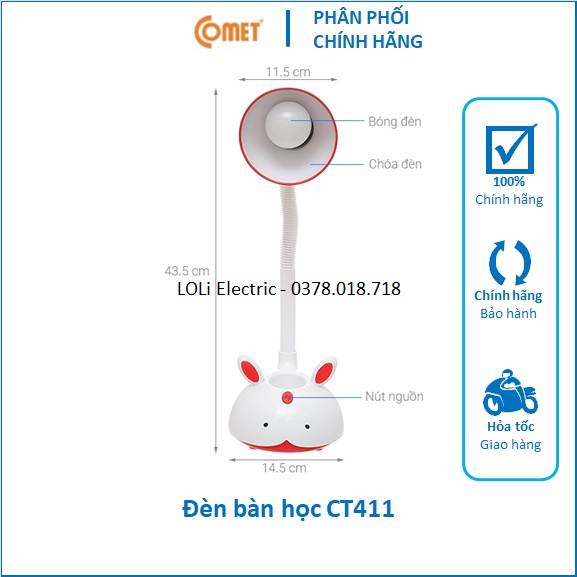 Đèn Bàn Led Comet Có Sẵn Bóng Bulb Tuổi Thọ Cao, Bảo Hành 12 Tháng Lỗi 1 Đổi 1 Trong 6 Tháng ĐÈN BÀN COMET CT412 CÁ HEO – Đèn Bàn Học Sinh Comet CT412 được làm bằng chất liệu nhựa ABS cao cấp, có độ bền cao. – Chịu lực và chịu nhiệt tốt, dễ dàng lau chùi khi bám bẩn. Sản phẩm không chứa các hóa chất gây hại, đảm bảo an toàn cho sức khỏe người sử dụng. ƯU ĐIỂM ĐÈN BÀN HỌC SINH COMET CT412: – Sử dụng bóng LED COMET 5W ánh sáng trắng, tiết kiệm điện năng kết hợp chóa đèn tản sáng tốt. – Công suất tối đa 60W – Nguồn phát sáng an toàn, không tia tử ngoại, không sóng điện từ, chống lóa mắt, giúp bảo vệ tối ưu cho đôi mắt của bé. – Thiết kế tiện dụng với khả năng dễ dàng xoay chuyển, giúp bạn có thể tùy chỉnh độ cao, thấp của thân đèn hoặc góc chiếu tùy thích rất dễ dàng. – Sản phẩm được trang bị đui đèn E27 để bạn có thể dùng được nhiều loại bóng đèn khác nhau như: bóng LED, bóng compact… – Bạn có thể điều chỉnh tắt mở một cách thuận tiện với nút công tắc được trang bị ngay trên đế đèn. – Kiểu dáng tinh tế đẹp mắt với màu sắc nổi bật cùng thiết kế hộp đựng bút đa năng tiện lợi. Đèn bàn Comet CT412 sẽ mang đến sự sinh động và tươi mới cho không gian bàn học của bé cũng như không gian sống của gia đình bạn. – Sản phẩm bảo hành chính hãng 12 tháng ĐÈN BÀN COMET CT413 – Đèn Bàn Học Sinh Comet CT413 được làm bằng chất liệu nhựa ABS cao cấp, có độ bền cao. – Chịu lực và chịu nhiệt tốt, dễ dàng lau chùi khi bám bẩn. Sản phẩm không chứa các hóa chất gây hại, đảm bảo an toàn cho sức khỏe người sử dụng. ƯU ĐIỂM ĐÈN BÀN HỌC SINH COMET CT413: – Sử dụng bóng LED COMET 5W ánh sáng trắng, tiết kiệm điện năng kết hợp chóa đèn tản sáng tốt. – Công suất tối đa 60W – Nguồn phát sáng an toàn, không tia tử ngoại, không sóng điện từ, chống lóa mắt, giúp bảo vệ tối ưu cho đôi mắt của bé. – Thiết kế tiện dụng với khả năng dễ dàng xoay chuyển, giúp bạn có thể tùy chỉnh độ cao, thấp của thân đèn hoặc góc chiếu tùy thích rất dễ dàng. – Sản phẩm được trang bị đui đèn E27 để bạn có thể dùng được nhiều loại bóng đèn khác nhau như: bóng LED, bóng compact… – Bạn có thể điều chỉnh tắt mở một cách thuận tiện với nút công tắc được trang bị ngay trên đế đèn. – Kiểu dáng tinh tế đẹp mắt với màu sắc nổi bật cùng thiết kế hộp đựng bút đa năng tiện lợi. Đèn bàn Comet CT413 sẽ mang đến sự sinh động và tươi mới cho không gian bàn học của bé cũng như không gian sống của gia đình bạn. – Sản phẩm bảo hành chính hãng 12 tháng ĐÈN BÀN COMET CT411 – Đèn Bàn Học Sinh Comet CT411R được làm bằng chất liệu nhựa ABS cao cấp, có độ bền cao. – Chịu lực và chịu nhiệt tốt, dễ dàng lau chùi khi bám bẩn. Sản phẩm không chứa các hóa chất gây hại, đảm bảo an toàn cho sức khỏe người sử dụng. ƯU ĐIỂM ĐÈN BÀN HỌC SINH COMET CT411R: – Sử dụng bóng LED COMET 5W ánh sáng trắng, tiết kiệm điện năng kết hợp chóa đèn tản sáng tốt. – Công suất tối da 60W – Nguồn phát sáng an toàn, không tia tử ngoại, không sóng điện từ, chống lóa mắt, giúp bảo vệ tối ưu cho đôi mắt của bé. – Thiết kế tiện dụng với khả năng dễ dàng xoay chuyển, giúp bạn có thể tùy chỉnh độ cao, thấp của thân đèn hoặc góc chiếu tùy thích rất dễ dàn