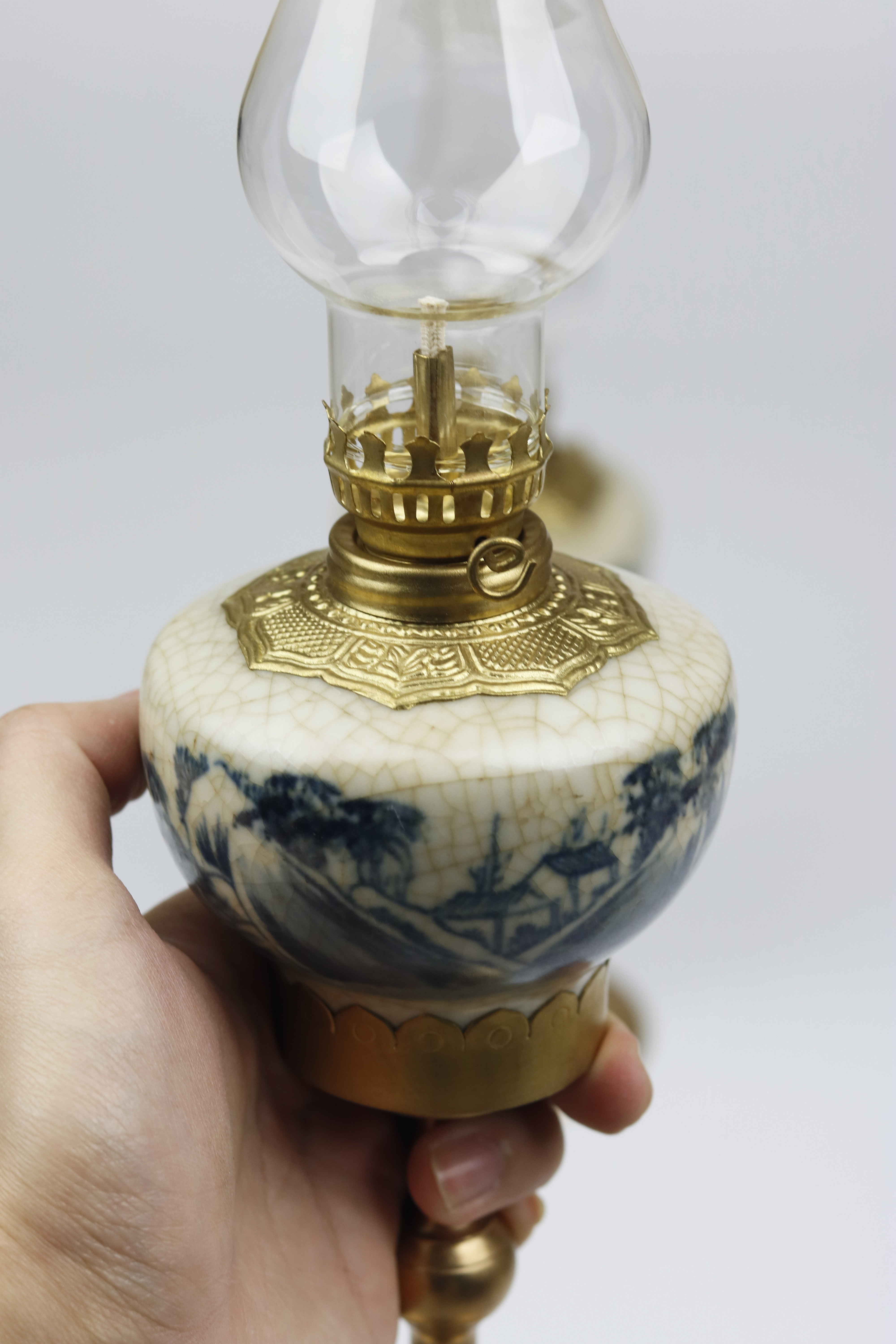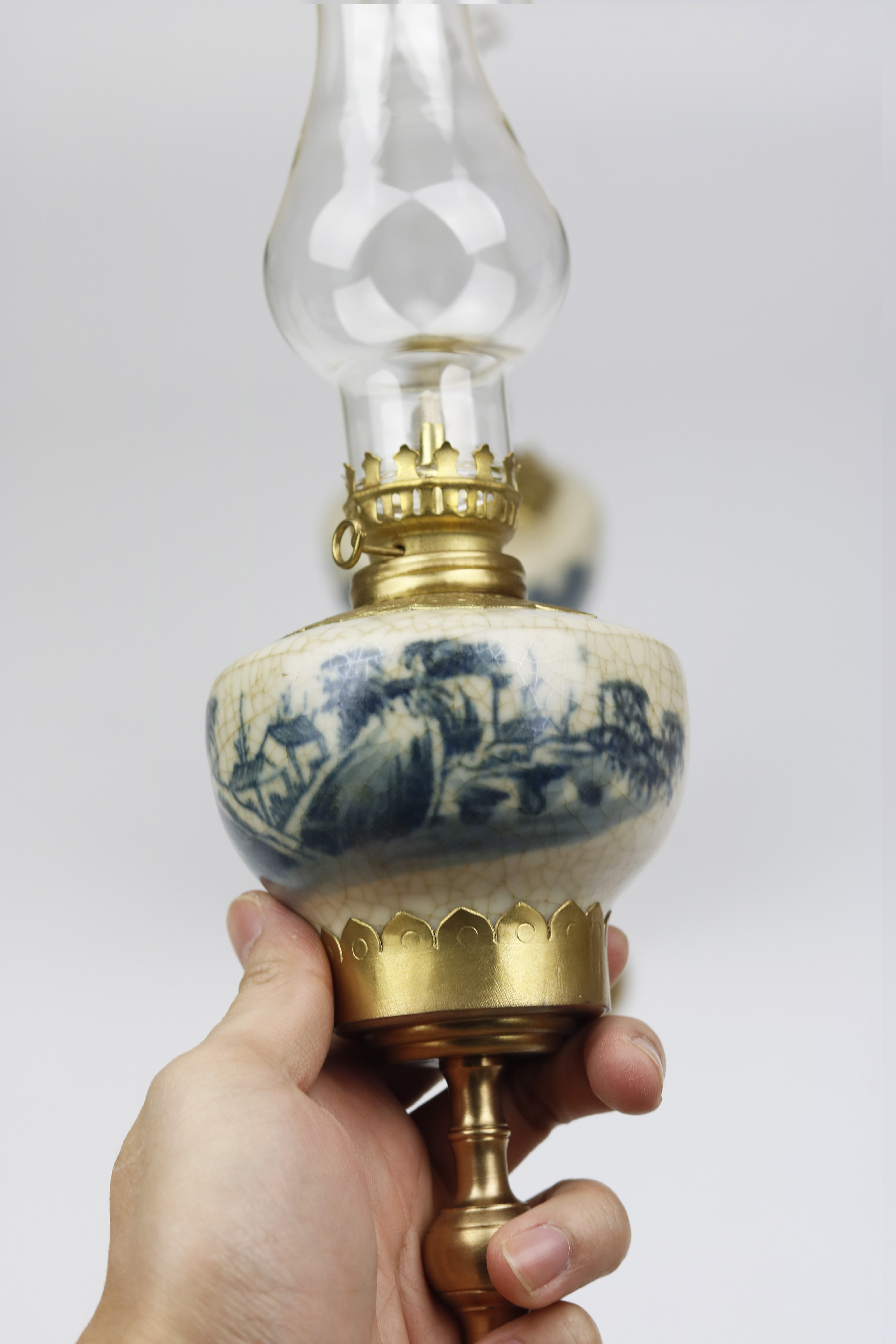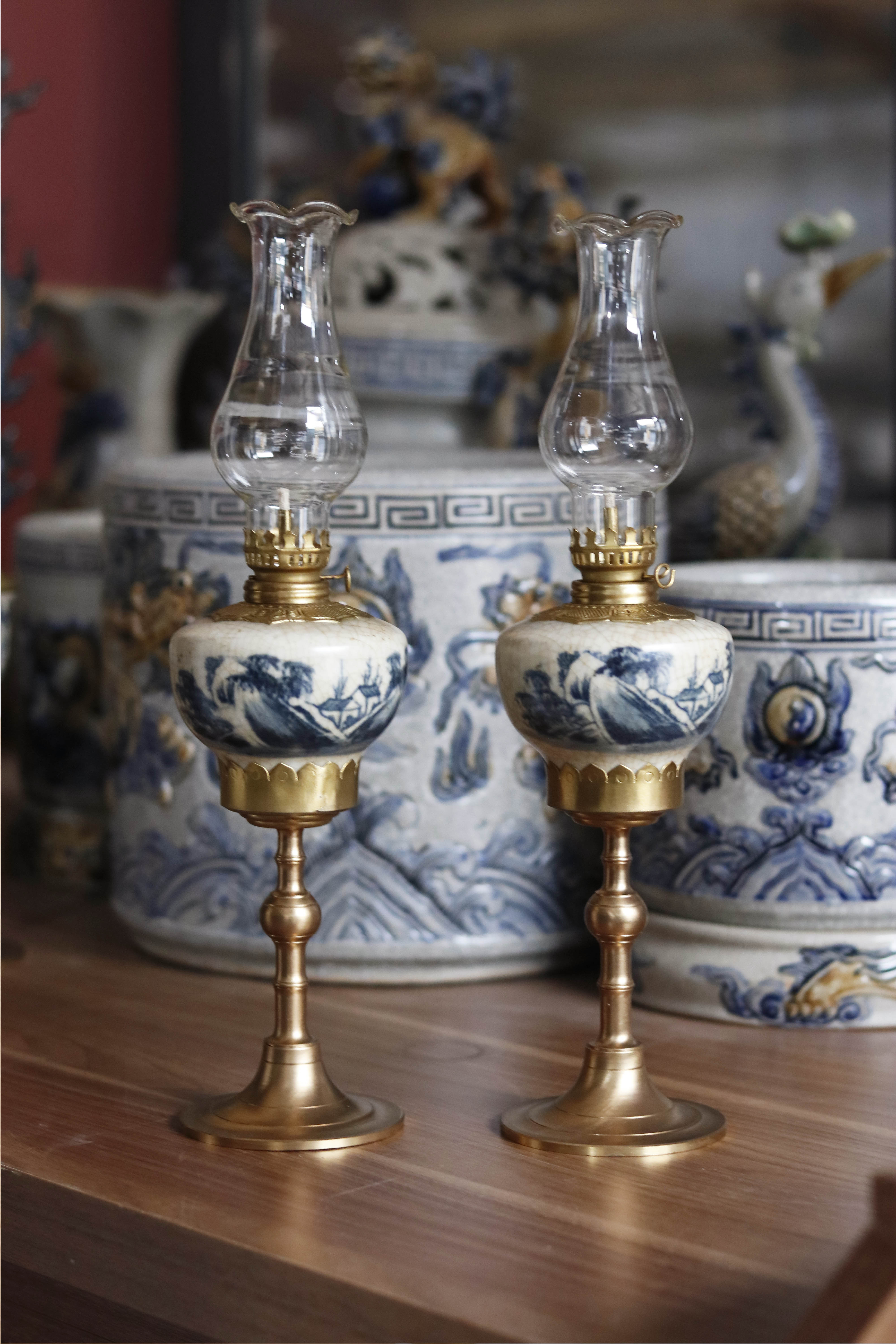 Đèn dầu Bát Tràng - Sản phẩm bao gồm: đèn + bóng đèn - Đèn dầu Bát Tràng men lam bọc đồng được nung ở nhiệt độ 1200 đến 1300 độ C nên có độ