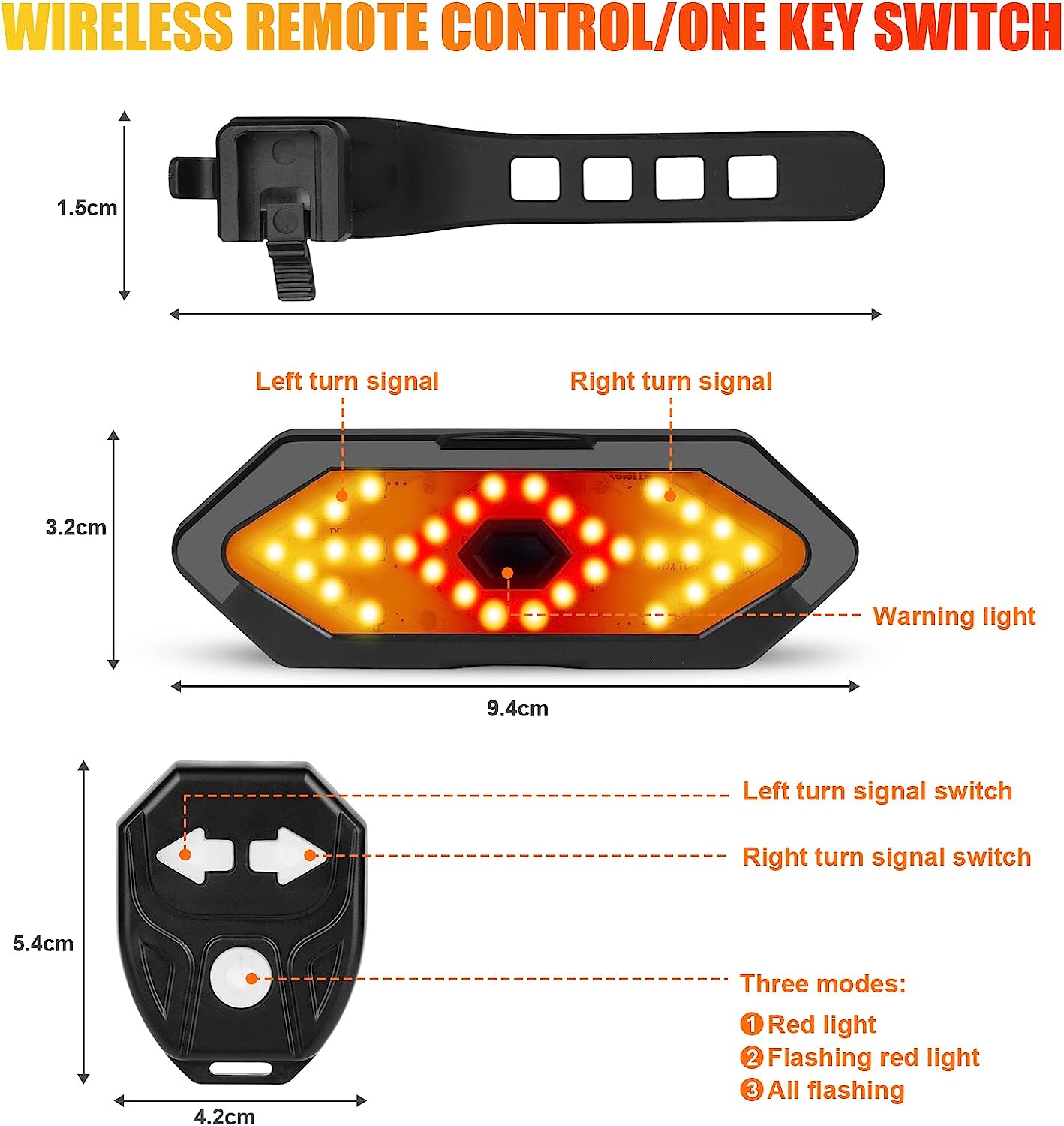 - Đèn xi nhan xe đạp - Đèn LED tín hiệu điều khiển từ xa gắn đuôi xe đạp - lắp đặt dễ dàng - - Điều khiển từ xa không dây, dễ sử dụng,