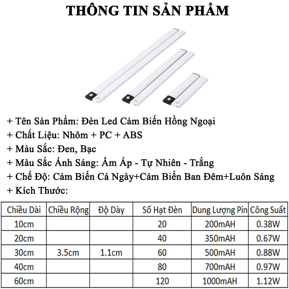 - THÔNG TIN SẢN PHẨM - Chất Liệu: Nhôm + PC + ABS - Màu Sắc: Đen, Bạc - Màu Sắc Ánh Sáng: Ấm(3000K), Tự Nhiên(4000K), Trắng(6000K) - Chế Độ: Cảm Biến Cả Ngày, Cảm Biến Ban Đêm, Chế Độ Luôn Sáng - Thời Gian Sạc: ~ 2h - Bộ Sản Phẩm Gồm: Đèn, 2 Miếng Dính Từ Tính, Cáp Sạc Micro USB. - Kích Thước: Xem Chi Tiết Trên Ảnh - Trọng Lượng: 32g/55g/77g/102g/145g ~ 10/20/30/40/60 cm