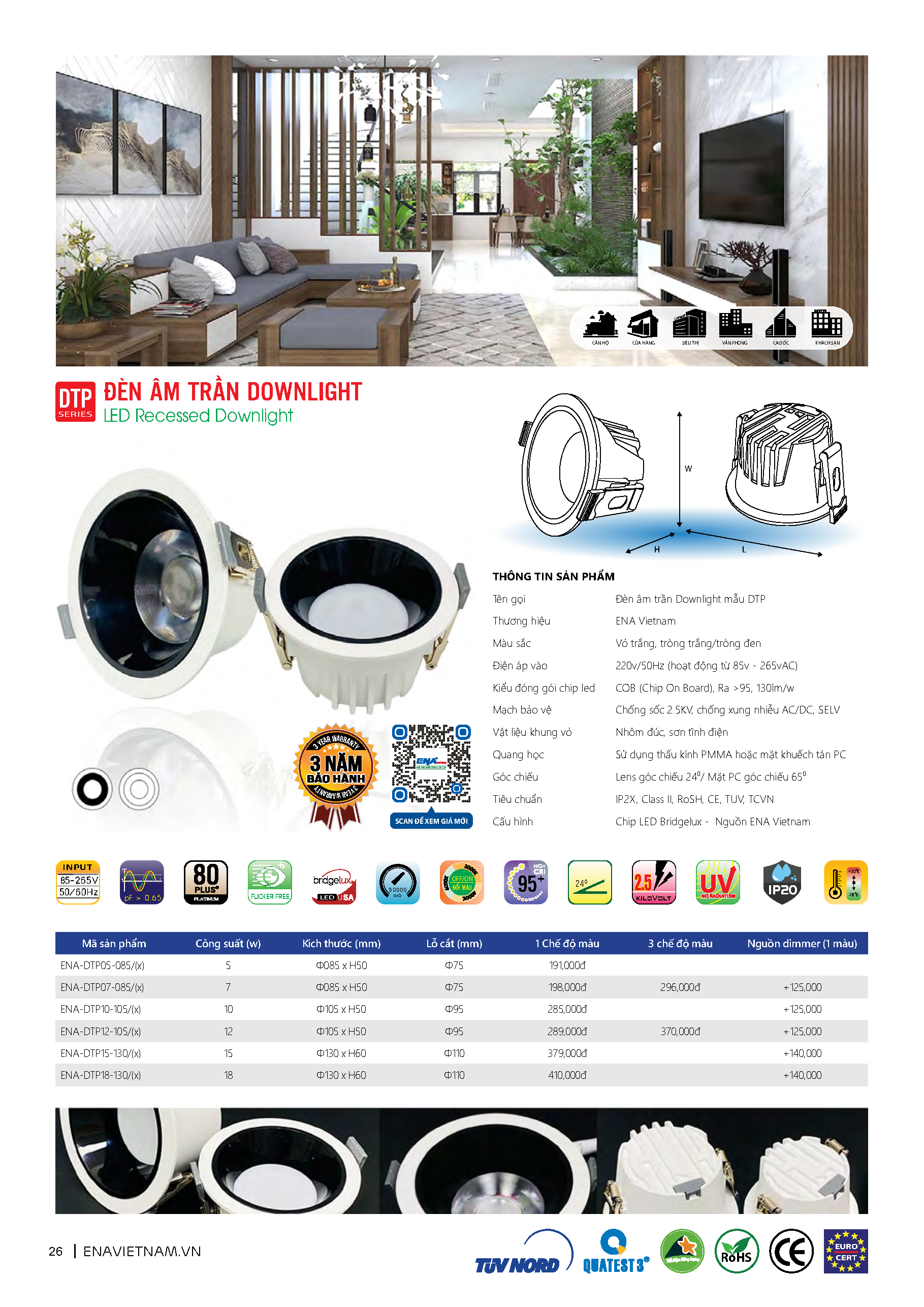Model: D AT02L ĐM 90/7W Dải điện áp hoạt động: (150 - 220VAC)/50Hz Quang thông: 510lm/550lm/470lm Nhiệt độ màu: 6500K/4000K/3000K Kích thước (ØxH): (118x35)mm ĐK lỗ khoét trần: 90mm Chất lượng ánh sáng cao (CRI>