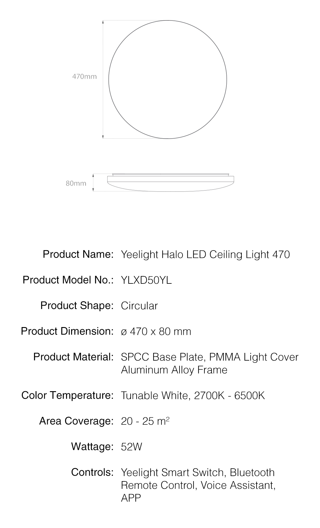 - Chưa kèm Remote Đèn thông minh Cho mọi căn nhà Thiết kế nắp che ánh sáng được cập nhật sử dụng vật liệu acrylic trong suốt và quy trình phim độc đáo, cho phép tạo ra ánh sáng dịu nhẹ mà không chói lóa. Một chiếc đèn trần sẽ làm sáng mọi góc của căn phòng và còn có thể điều chỉnh nhiệt độ và màu ánh sáng theo tâm trạng (3500lm @ 4000K). Đèn ốp trần Yeelight Halo Pro 470 LED Ceiling Light YLXD50YL thông minh chất lượng cao. Đèn ốp trần là một thiết bị chiếu sáng hữu ích và cần thiết trong mỗi gia đình. Hãy nâng cấp chúng lên một phiên bản thông minh và cao cấp hơn với Yeelight. Đèn ốp trần Yeelight Halo 470 có công suất 52W, cường độ sáng: 3500lm – 4000k. Độ sáng này có thể sử dụng cho mọi căn phòng như phòng ngủ, phòng khách khoảng 25m2. Tuy đèn có công suất cao nhưng được thiết kế với bề mặt acrylic trong suốt tạo ra ánh sáng dịu nhẹ mà không chói lóa. Trang bị ánh sáng hắt trần RGB Dòng đèn Halo được trang bị cả ánh sáng chính và ánh sáng hắt trần RGB 16 triệu màu, bạn có thể sử dụng kết hợp để tăng cường môi trường ánh sáng trong phòng hoặc sử dụng riêng biệt với ánh sáng tinh tế hơn để cânbằng tâm trạng. Tương thích cho những cuộc phiêu lưu vào ban đêm của bạn Đèn Halo hỗ trợ chế độ ánh sáng mặt trăng với các sắc thái và độ sáng có thể tùy chỉnh. Một dải thiên hà ở trạng thái ánh sáng mặt trăng là hoàn hảo cho ban đêm vì nó có thể phát ra ánh sáng dịu nhẹ, thoải mái và không chói mắt. Đèn có chỉ số hoàn màu (Ra) lên đến 95, có nghĩa là nó có thể hiển thị chính xác đến 95% màu ánh sáng mặt trời tự nhiên và nhìn thế giới sống động như vốn có. Nhiệt độ màu có thể điều chỉnh cho các mục đích sử dụng khác nhau Tùy chỉnh nhiệt độ màu của bạn từ 2700K đến 6500K. Các màu dưới 3200K phát ra ánh sáng ấm áp, 3300K-5300K hiển thị ánh sáng trung tính cho tâm trạng dễ chịu và thanh thản, trên 5300K hiển thị ánh sáng mát để giúp mọi người tập trung. Các nhiệt độ màu khác nhau này giúp điều chỉnh ánh sáng phù hợp với từng mục đích sử dụng, từ đèn ngủ cho đến đèn làm việc/học tập. Đèn Yeelight Halo áp dụng thiết kế nhiều lớp cho vỏ đèn của mình. Nó sẽ vẫn sáng bóng và rõ ràng do có thể ngăn chặn bụi và côn trùng tích tụ trong ánh sáng. Tương thích với Apple Siri, Mijia App, Google Home, Amazon Alexa dễ dàng điều khiển đèn bằng giọng nói hoặc điện thoại thông minh của bạn. Chỉ một chạm hoặc ra lệnh có thể thay đổi nhiệt độ màu/ cường độ sáng ngay khi bạn đã nghỉ ngơi trên chiếc giường của mình.