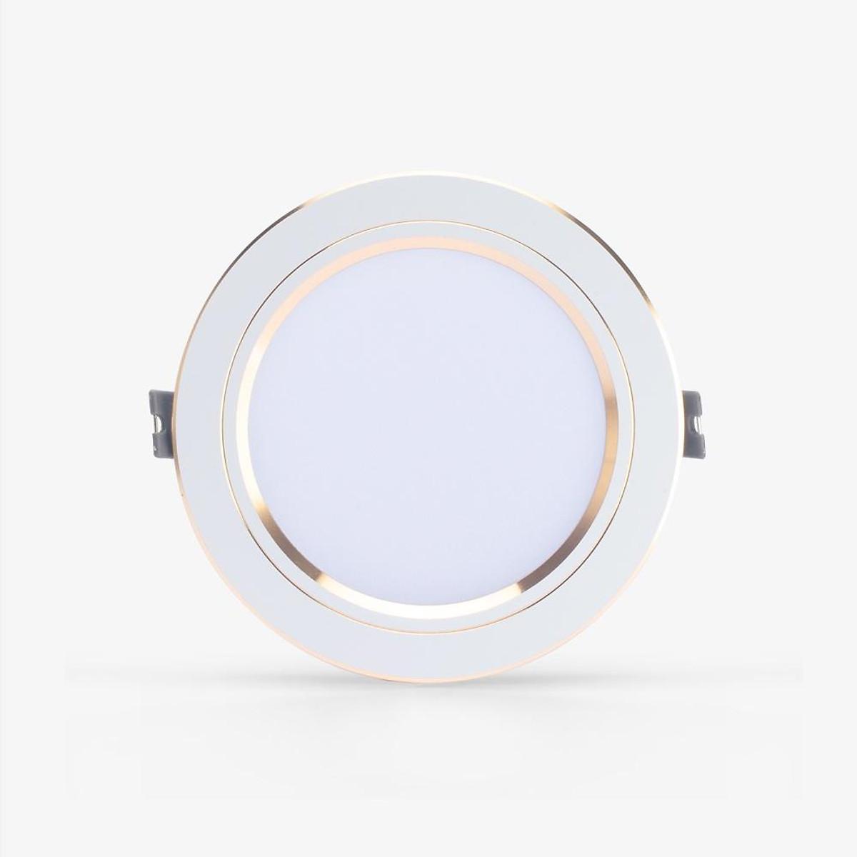 Đèn LED Âm trần Downlight 110/9W Viền Vàng Model: AT10 110/9W (G) Công suất: 9W Điện áp: 220V/50-60Hz Quang thông: 900lm Nhiệt độ màu: 6500K/3000K Kích thước (ØxH): (138x36)mm ĐK lỗ khoét trần: 110mm Sử