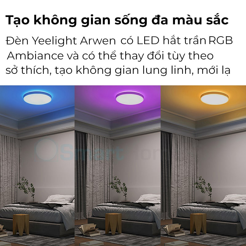 - Moon light: Ánh sáng dịu nhẹ như ánh trăng, có thể dùng như đèn ngủ. Thích hợp cho cả phòng em bé Công suất lên đến 50W với các bóng led được bố trí hợp lý giúp ánh sang lan toả tối ưu và đồng đều. Bề mặt đèn được phủ nhựa nhẵn mịn, cho ánh sáng dịu nhẹ, không gây lóa mắt. Led hắt trần RGB cho màn đêm lãng mạn Dòng đèn trần Yeelight Arwen có trang bị led hắt trần RGB 16 triệu màu để bạn có thể tuỳ chỉnh theo tâm trạng. Bạn có thể cùng lúc bật cả đèn nền và đèn RGB để tạo ra một môi trường thơ mộng và cá tính. Cơ chế cài đặt nhanh được cấp bằng sáng chế Cơ chế độc đáo của Yeelight giúp bạn dễ dàng hơn trong việc lắp đặt 1 chiếc đèn trần cỡ lớn. Thuận tiện hơn khi bạn muốn thay đổi các đèn khác nhau, hay tháo xuống vệ sinh/bảo hành bảo dưỡng…Bạn cũng không cần phải thiết kế lại nhà của mình mới có thể lắp đèn. Đèn Yeelight có thể lắp tại nhà chỉ trong vòng 15p với phụ kiện đi kèm. Vô cùng thuận tiện và dễ dàng.