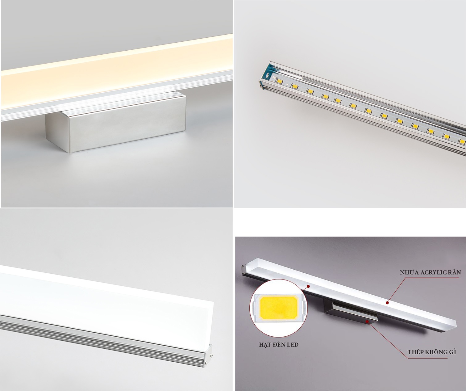 Chất liệu inox không gỉ sáng bóng siêu bền Nhân LED sáng và sáng đều. Điều chỉnh được góc chiếu của đèn Dài 55 (cm) Công suất 12W – Sáng tương đương 40W bóng sợi