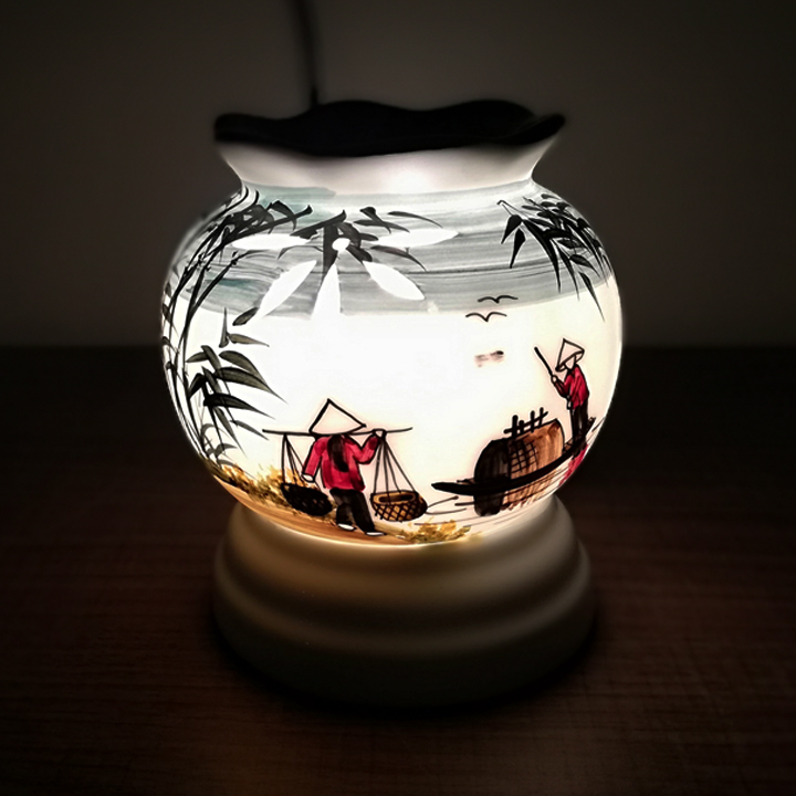 - Đèn xông tinh dầu sử dụng điện tạo ra nhiệt để khuếch tán hương thơm đi xa hơn, là loại sản phẩm xông hương tinh dầu thiên nhiên khá phổ biến hiện nay. Đèn xông tinh dầu được các nghệ nhân làng nghề Bát Tràng thổi hồn vào bằng những nét vẽ thủ công cực kỳ tỉ mỉ. Khắc họa nên những họa tiết non nước Việt Nam, từ phố cổ bình yên đến Tháp Rùa, đến Chùa 1 Cột, từ những mùa Hoa Phượng, đến cầu Huế mộng mơ, thổi vào lòng người dạ khúc hân hoan, ấm cúng để tất cả mảnh ghép ấy mang đến sự hoài cổ, bình yên, nhẹ nhàng tĩnh lặng.