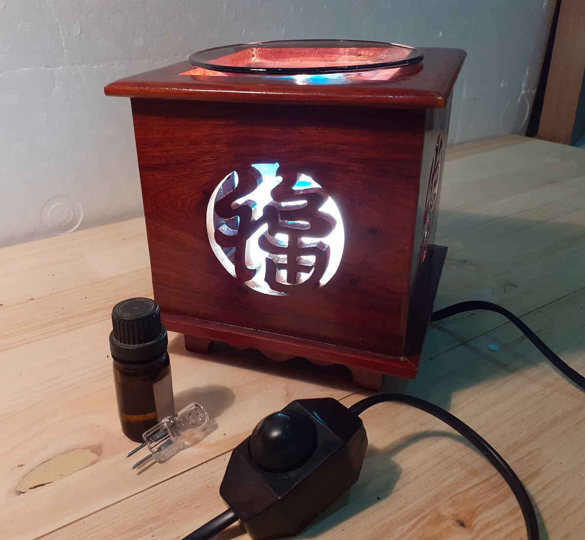 Đèn xông tinh dầu gỗ hương- Chữ Phúc- chữ thọ Đèn xông tinh dầu Cao cấp chữ Thọ Nguyên liệu: Vỏ đèn gỗ hương tự nhiên Đĩa đèn xông tinh dầu: đĩa thủy tinh, 1