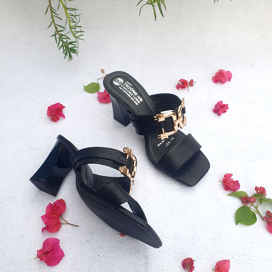 - Dép nữ cao gót quai ngang một bản TRường Hải màu đen gót vuông 8cm da mềm DN139 thiết kế với kiểu dáng ôm chân, thon gọn, thoải mái di chuyển mà không lo