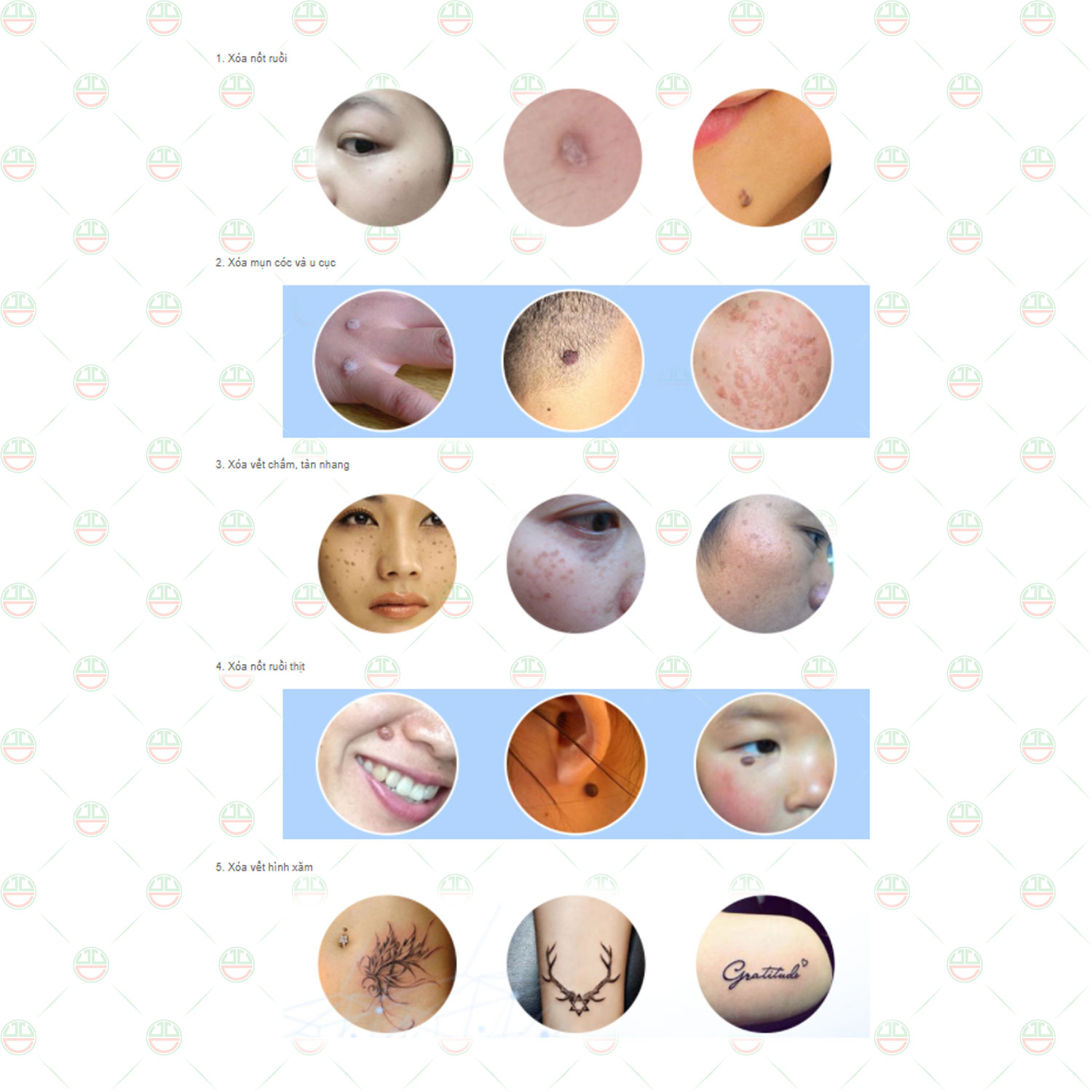 - Đốt điện sinh ion cacbonat điện ngay lập tức quét nám, tàn nhang, đốm tuổi, nốt ruồi phẳng, mụn thịt, một cách nhanh chóng mà không gây chảy máu tổn hại mô biểu bì sâu hoặc dây thần kinh ngoại biên.