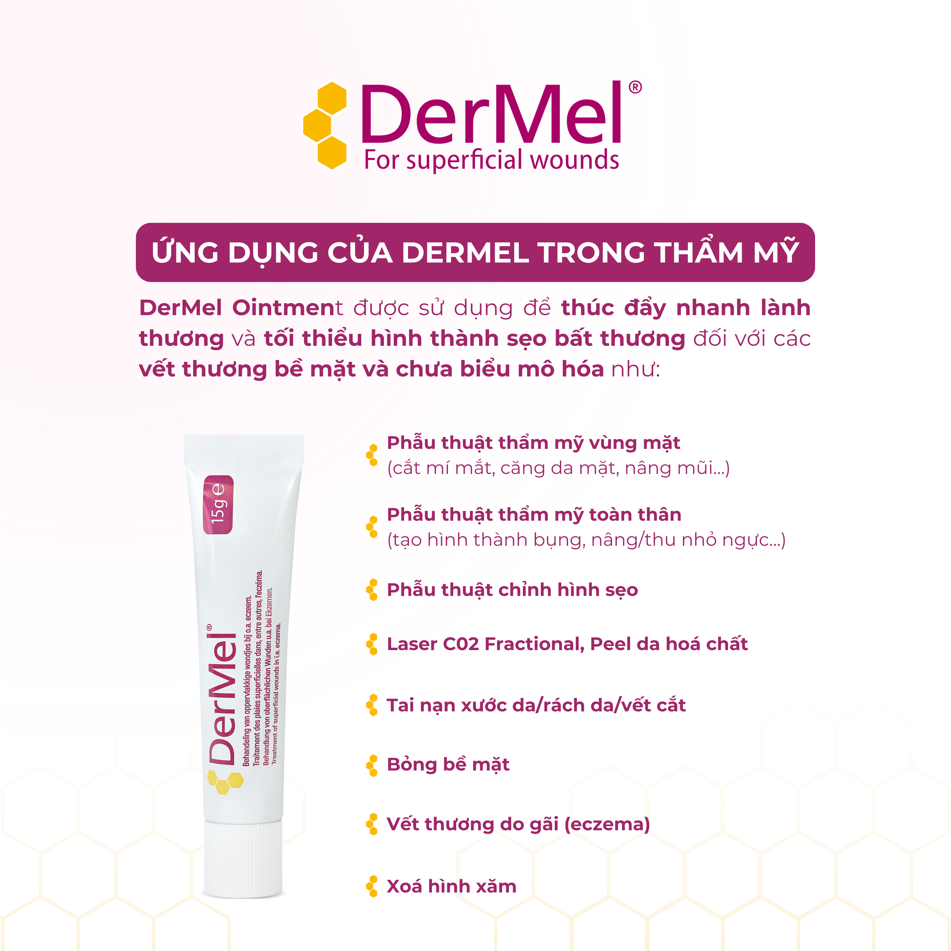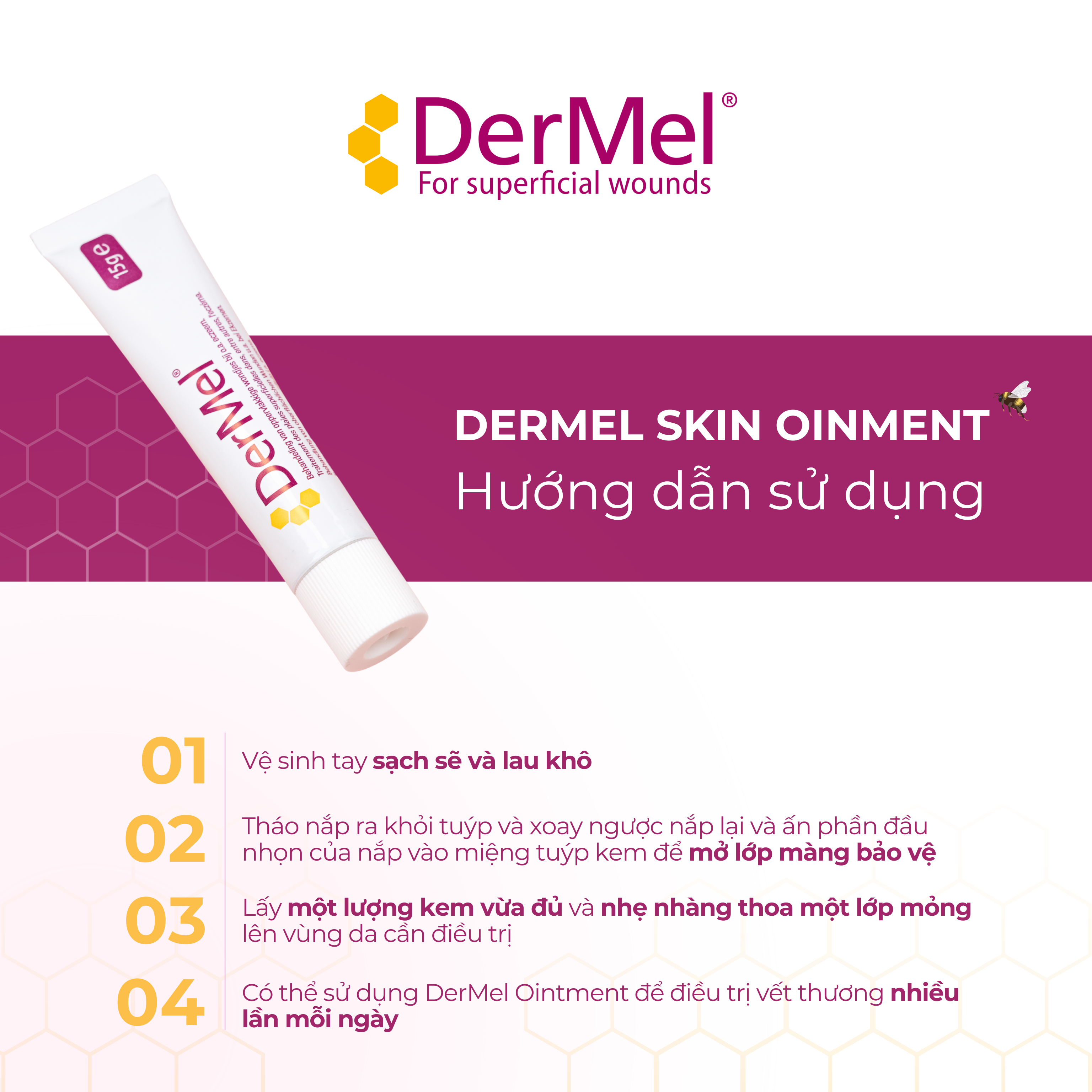 - DerMel Skin Ointment (15g và 50g) là một loại kem làm dịu da để phòng ngừa các vết thương nông và vết thương bề mặt. Với thành phần chính là mật ong y tế nguyên chất và giàu enzyme (Glucose oxidase), DerMel Ointment giúp mang lại pH thấp và củng cố sức đề kháng tự nhiên của da. DerMel Ointment có tác dụng làm mát nhẹ nhàng trên da, do đó có tác dụng giảm ngứa.