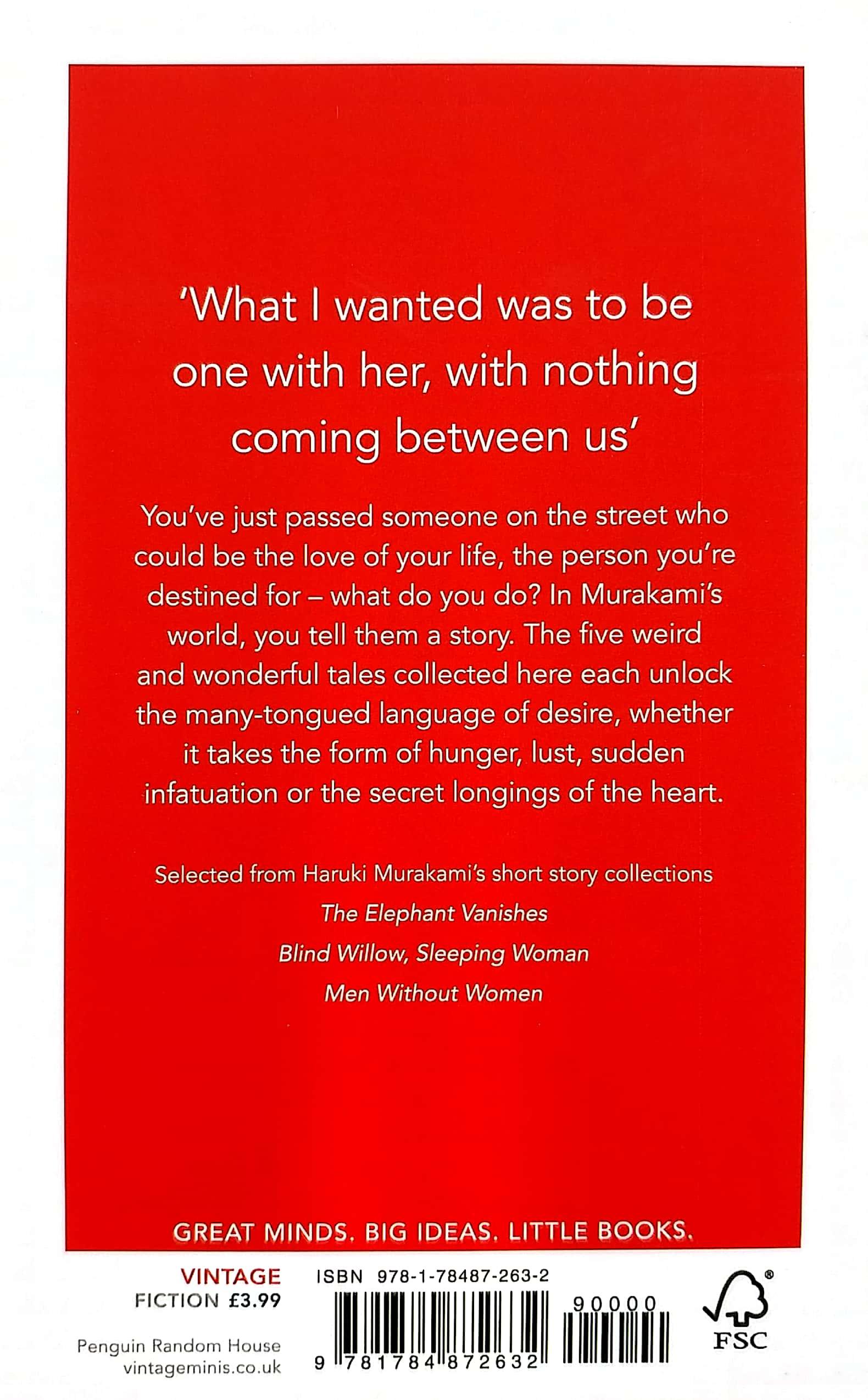You've just passed someone on the street who could be the love of your life, the person you're destined for - what do you do? In Murakami's world, you tell them a story. The five weird and wonderful tales collected here each unlock the many-tongued language of desire, whether it takes the form of hunger, lust, sudden infatuation or the secret longings of the heart.
