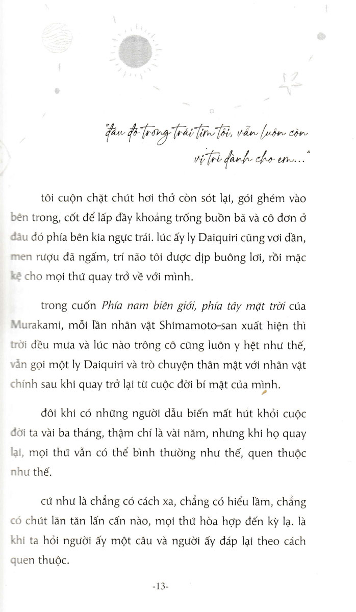 Chỉ Cần Lòng Mình Có Nắng Với bạn thời gian là hữu hạn hay vô hạn? Có lẽ sẽ không ai tìm được đáp án chung cho câu hỏi này nhưng dù chúng ta nhìn nhận và cảm thấy như thế nào về thời gian, nó vẫn sẽ lặng lẽ trôi qua và không dừng lại vì bất kỳ ai hay bất cứ lý do gì. “Chỉ cần lòng mình có nắng” chính là những mảng kí ức được góp nhặt lại trong “dòng thời gian” của HIRO t. Từ tuổi trẻ đầy nhiệt huyết, mang trong mình tinh thần xông pha khám phá thế giới nhưng cũng không ít lần phải rơi lệ khi vấp ngã vì chính sự non dại của bản thân. Đến khi trưởng thành đạt được những thành công nhất định lại đánh mất đi ngọn lửa mang tên ước mơ trong mắt của người thiếu niên năm nào. Trong dòng thời gian đó chứa đựng cả những câu chuyện thường ngày như việc thức dậy mỗi sáng mai, dọn dẹp lại nhà cửa, những buổi ôn thi miệt mài vì điểm số hay đơn giản chỉ là bữa cơm với gia đình. Những việc tưởng chừng như vô cùng bình thường ấy lại đem đến cho chúng ta nhiều triết lý sâu sắc từ chính chiêm nghiệm của tác giả. Đôi khi, chính những chi tiết nhỏ mới là thứ đắt giá, và viết ra được một chi tiết như vậy là một thử thách vô cùng khó nhằn. Tác giả HIRO t đã viết nên cuốn sách “Chỉ cần lòng mình có nắng” với chính tâm niệm như vậy. Với anh, mọi việc xảy ra trong cuộc sống đều có ý nghĩa chỉ là chúng ta có nhận ra hay không mà thôi. Nhưng tất nhiên thế giới này không phải luôn vận hành theo cách mà ta mong muốn. Dù bạn thấy mệt mỏi hay ồn ào tới mức muốn dừng lại tất cả để “khiếu nại” về những bất công phi lý mình phải gánh chịu thì thế giới bên ngoài vẫn sẽ xoay chuyển như bao lâu nay vốn vậy. Những lúc như thế, hãy tìm tới thế giới bên trong của riêng mình, nơi bạn có thể tạm thời nghỉ ngơi. Bạn không biết được lựa chọn sẽ dẫn mình tới đâu, nhưng miễn ta sống hết mình với lựa chọn ấy thì đến cuối cùng, có lẽ không còn gì đáng hối tiếc cả. Bạn không thể kiểm soát một cơn mưa, nhưng có thể lựa chọn ở trong nhà hay mặc áo mưa rồi đi ra ngoài. Bạn không thể kiểm soát lời nói hay hành động xấu xí từ người khác, nhưng có thể lựa chọn cách đáp lại. Bạn không thể kiểm soát những năm tháng khó khăn, nhưng có thể lựa chọn một tinh thần lạc quan và một nụ cười vui vẻ. Rồi bạn sẽ tự tìm được hạnh phúc từ những điều bình dị nhất trong cuộc sống “chỉ cần lòng bạn có nắng”.