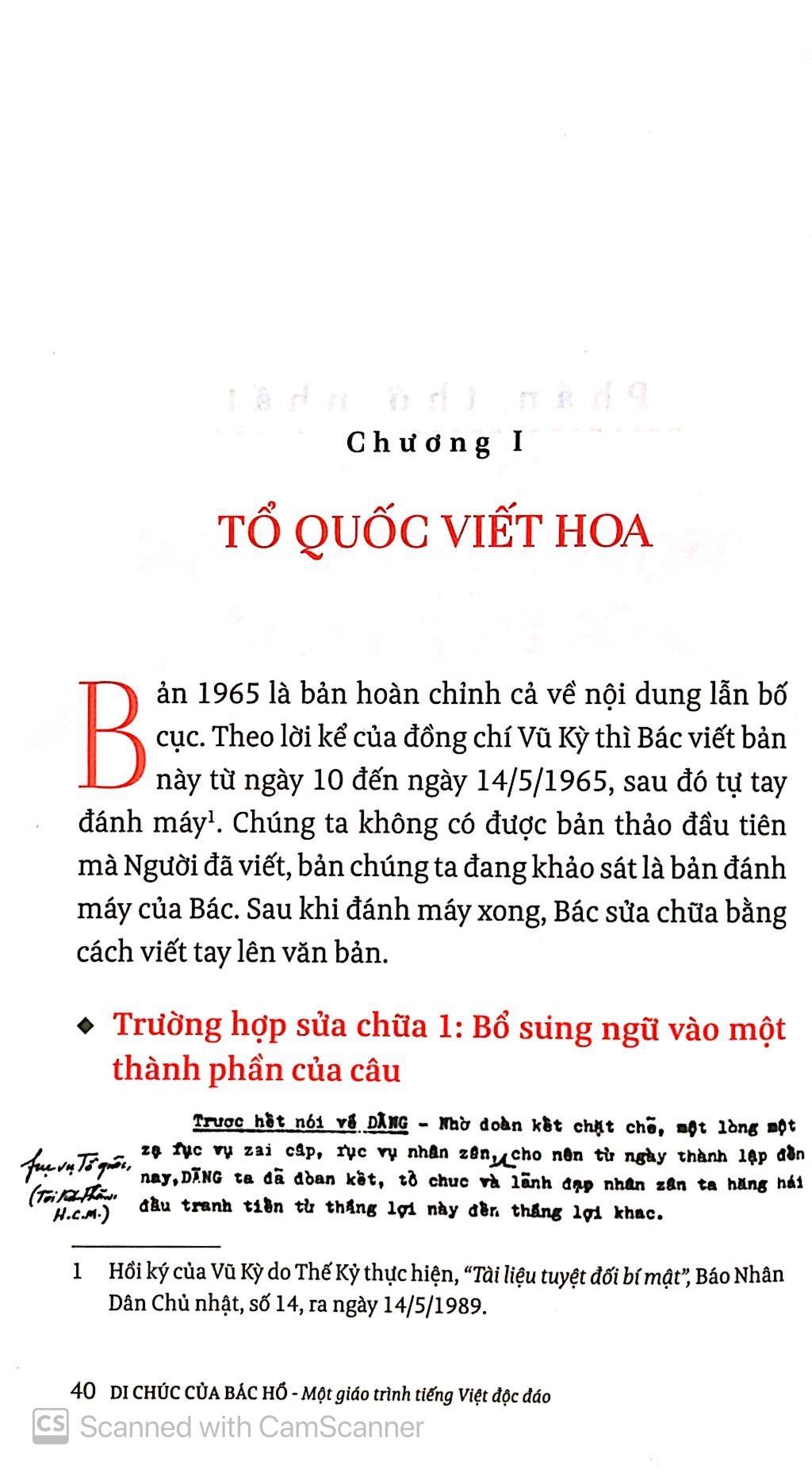 Mua tại TiktokDi Sản Hồ Chí Minh - Di Chúc Của Bác Hồ - Một Giáo Trình Tiếng Việt Độc Đáo Sách khảo sát các trường hợp Bác Hồ tự sửa chữa trong quá trình viết Di chúc nhằm tìm hiểu việc sử dụng ngôn ngữ của Người, để từ đó rút ra những bài học thực tiễn về các trường hợp nói và viết có hiệu lực .