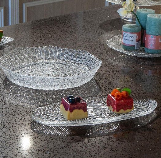 Thiết kế đẹp mắt hình eo. Có thể thả hoa, bày trái cây, bày món tráng miệng như chè, hoa quả thái miếng hoặc bày đồ ăn (salad, súp, hoặc nguyên cả con cá dài).