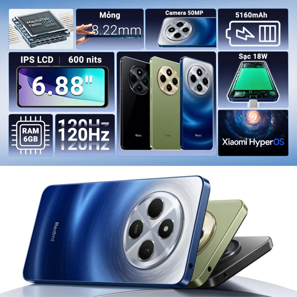 Thắng thao mobile cam kết Hàng nguyên hộp mới 100% Bảo hành 6 tháng phần cứng,12 tháng phần mềm Thông số sản phầm Kích thước màn hình :6.88 inches Camera sau:50MP Camera trước:8MP Chip:Snapdragon 4 Gen 2 Dung lượng RAM:6 GB Bộ nhớ trong :128 GB Pin:5160mAh Thẻ SIM:2 SIM (Nano-SIM) Độ phân giải màn hình:720 x 1640 pixels Tính năng màn hình:Tốc độ làm mới lên tới 120Hz Độ sáng: 450 nits (typ), 600 nits (HBM) Xiaomi Redmi 14C 5G là lựa chọn hoàn hảo trong phân khúc tầm trung, nổi bật với màn hình sắc nét, hiệu năng mạnh mẽ, thiết kế hiện đại và hệ thống camera linh hoạt. Với dung lượng pin lớn và khả năng sạc nhanh, sản phẩm này đáp ứng tốt nhu cầu sử dụng hằng ngày, mang đến trải nghiệm vượt trội cho người dùng. Hiển thị sống động và bảo vệ tối ưu Màn hình của Xiaomi Redmi 14C là một trong những điểm nổi bật nhất của sản phẩm, với tấm nền IPS LCD kích thước 6.88 inch. Độ phân giải cao kết hợp với tần số quét 120 Hz giúp hình ảnh hiển thị mượt mà, sắc nét, đặc biệt là khi chơi game hay xem video. Tần số quét cao này cũng giảm hiện tượng nhòe hình khi di chuyển nhanh, mang lại trải nghiệm sử dụng tuyệt vời. Ngoài ra, độ sáng 600 nits cho phép màn hình hiển thị rõ ràng ngay cả dưới ánh sáng mặt trời mạnh, điều này rất hữu ích cho người dùng hay sử dụng máy ngoài trời. Kính cường lực Gorilla Glass 3 cũng là một điểm cộng, giúp bảo vệ màn hình khỏi những va chạm và trầy xước trong quá trình sử dụng. Đa nhiệm mạnh mẽ và lưu trữ thoải mái Xiaomi Redmi 14C 5G được trang bị vi xử lý Snapdragon 4 Gen 2, kết hợp cùng 6 GB RAM, cho phép bạn xử lý mượt mà các tác vụ hằng ngày, từ lướt web, xem phim đến chơi game. Máy hỗ trợ chuyển đổi nhanh giữa các ứng dụng, đảm bảo trải nghiệm đa nhiệm không gián đoạn. Bên cạnh đó, với bộ nhớ trong 128 GB, người dùng có thể thoải mái lưu trữ dữ liệu mà không lo thiếu dung lượng. Đặc biệt, máy còn hỗ trợ mở rộng qua thẻ nhớ MicroSD lên đến 1 TB, một giải pháp lý tưởng cho những ai cần nhiều không gian lưu trữ. Giao diện Xiaomi HyperOS dựa trên Android 14 mang đến một trải nghiệm người dùng thân thiện, trực quan và đầy đủ tính năng. Hệ điều hành này cũng được tối ưu hóa để tận dụng tối đa hiệu năng của phần cứng, giúp máy hoạt động trơn tru hơn. Pin dung lượng cao, sạc nhanh tiện lợi Pin luôn là yếu tố quan trọng đối với người dùng smartphone và Redmi 14C 5G đã đáp ứng tốt yêu cầu này với viên pin dung lượng lớn 5160 mAh. Dung lượng này đủ để máy hoạt động liên tục trong một ngày dài mà không cần lo lắng về việc hết pin giữa chừng, đáp ứng nhiều tác vụ. Máy hỗ trợ sạc nhanh 18W, giúp người dùng tiết kiệm thời gian khi cần nạp lại năng lượng. Đặc biệt, Xiaomi tặng kèm củ sạc 33W, mặc dù công suất sạc tối đa của máy là 18W, nhưng việc tặng kèm củ sạc này mang lại sự tiện lợi đáng kể, đặc biệt là khi người dùng có nhiều thiết bị khác cần sạc với công suất lớn hơn. Hệ thống linh hoạt và đa dạng tính năng Hệ thống camera của chiếc điện thoại Xiaomi này cung cấp trải nghiệm chụp ảnh chất lượng với nhiều tính năng linh hoạt. Camera chính 50 MP là điểm mạnh, cho phép chụp ảnh với độ chi tiết cao, màu sắc trung thực. Tính năng HDR giúp cân bằng sáng tối, cho ra những bức ảnh đẹp ngay cả trong điều kiện ánh sáng phức tạp.