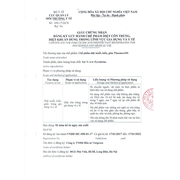 - Trong 3 ngày đầu phun xịt Thảo mộc 10S mỗi ngày 1 lần, sau đó giảm dần nên phun xịt theo định kỳ 7-15 ngày/lần,tùy mật độ côn trùng) để duy trì hiệu lực Thảo mộc 10S tạo môi trường trong nhà luôn sạch sẽ, không có côn trùng trú ẩn.