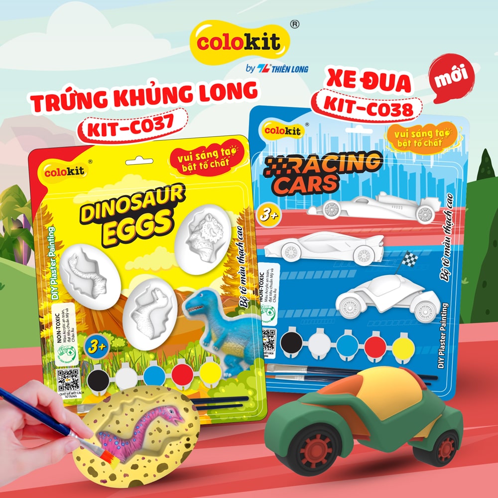 Mua tại TiktokThông số kĩ thuật : Thương hiệu Colokit Đóng gói 3 tượng + 2 cọ + vỉ 5 màu / kiện. Xuất xứ Việt Nam Trọng lượng 400 gram Kích thước tượng Đang cập nhật Khuyến cáo Tránh nguồn nhiệt, hóa chất. Không thích hợp cho trẻ dưới 3 tuổi. Tô tượng thạch cao Thiên Long Colokit trứng khủng long gồm vỉ 5 màu Acrilyc dung tích 5ml và tặng kèm 2 cọ vẽ chất lượng. Màu Acrylic vẽ được trên nhiều chất liệu như vải Canvas, Gỗ, Kim loại, Thạch cao, Nhựa, Thủy tinh, Gốm. Đặc điểm sản phẩm: