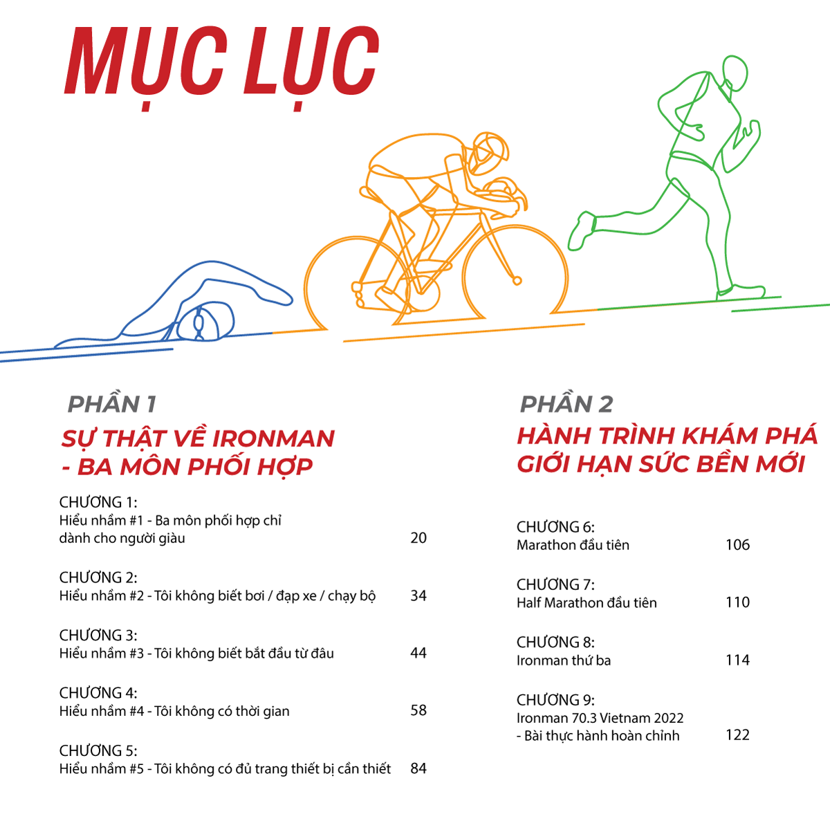 Tác giả giúp người mới chơi ba môn phối hợp bắt đầu thuận lợi hơn bằng cách chia sẻ những khó khăn và cách vượt qua chúng; liệt kê chi phí, danh sách đồ dùng tối thiểu để chinh phục Ironman 70.3.