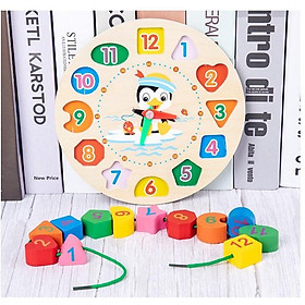 Đồng hồ gỗ xếp hình học xỏ dây cho bé học đếm giờ phân biệt màu sắc Montessorihình khối