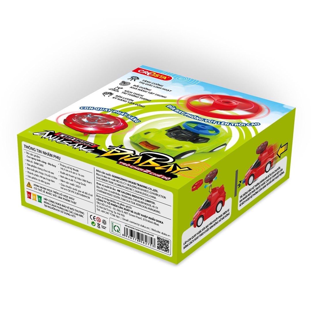 Con quay ánh sáng - Đĩa bay (Xanh nõn chuối), DK 81203 Đồ chơi con quay là sản phẩm đồ chơi cho bé được mô phỏng theo nội dung của các bộ phim hoạt hình hấp dẫn đang trình chiếu, nên các bé đều có tâm lý mong muốn sở hữu một món đồ chơi đầy ma lực này để giải trí sau những giờ học tập căng thẳng. Ngoài con quay nhiều màu sắc, sản phẩm còn kết hợp thêm các đĩa bay tạo thêm phần hấp dẫn khi chơi. Với kết cấu chắc chắn được thiết kế bằng nhựa ABS và kim loại đúc giúp con quay chịu lực va đập tốt, khi con quay chuyển động có đèn led phát sáng tạo sự hấp dẫn, bắt mắt.Khuôn viền được thiết kế không góc cạnh đảm bảo độ an toàn cho bé khi chơi. Phụ kiện chính kèm theo là chiếc ô tô mô hình được thiết kế bằng nhựa ABS nguyên khối, chịu được lực va chạm mạnh và ở mũi xe đều có các nút bật khi có lực tác động giúp con quay và đĩa bay vút lên cao. Trên mỗi bìa hộp đều có hướng dẫn sử dụng, cách chơi được mô tả chi tiết bằng tiếng Việt. Trò chơi mang lại các lợi ích cho bé như: - Tăng cường thị giác linh hoạt - Bồi dưỡng khả năng tập trung - Kích thích trí tưởng tượng - Rèn luyện kỹ năng vận động Sản phẩm đạt tiêu chuẩn: