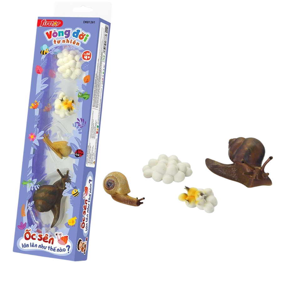 Set mô hình vòng đời tự nhiên của ốc sên trải qua 4 giai đoạn từ :Trứng - ấu trùng- ốc con - ốc trưởng thành. Mô hình nhằm giúp các em nhận biết được vòng đời của các côn trùng trong thế giới động, thực vật đồng thời giúp các em hiểu thêm về qui trình vận động, tiến hóa của thế giới tự nhiên quanh ta.