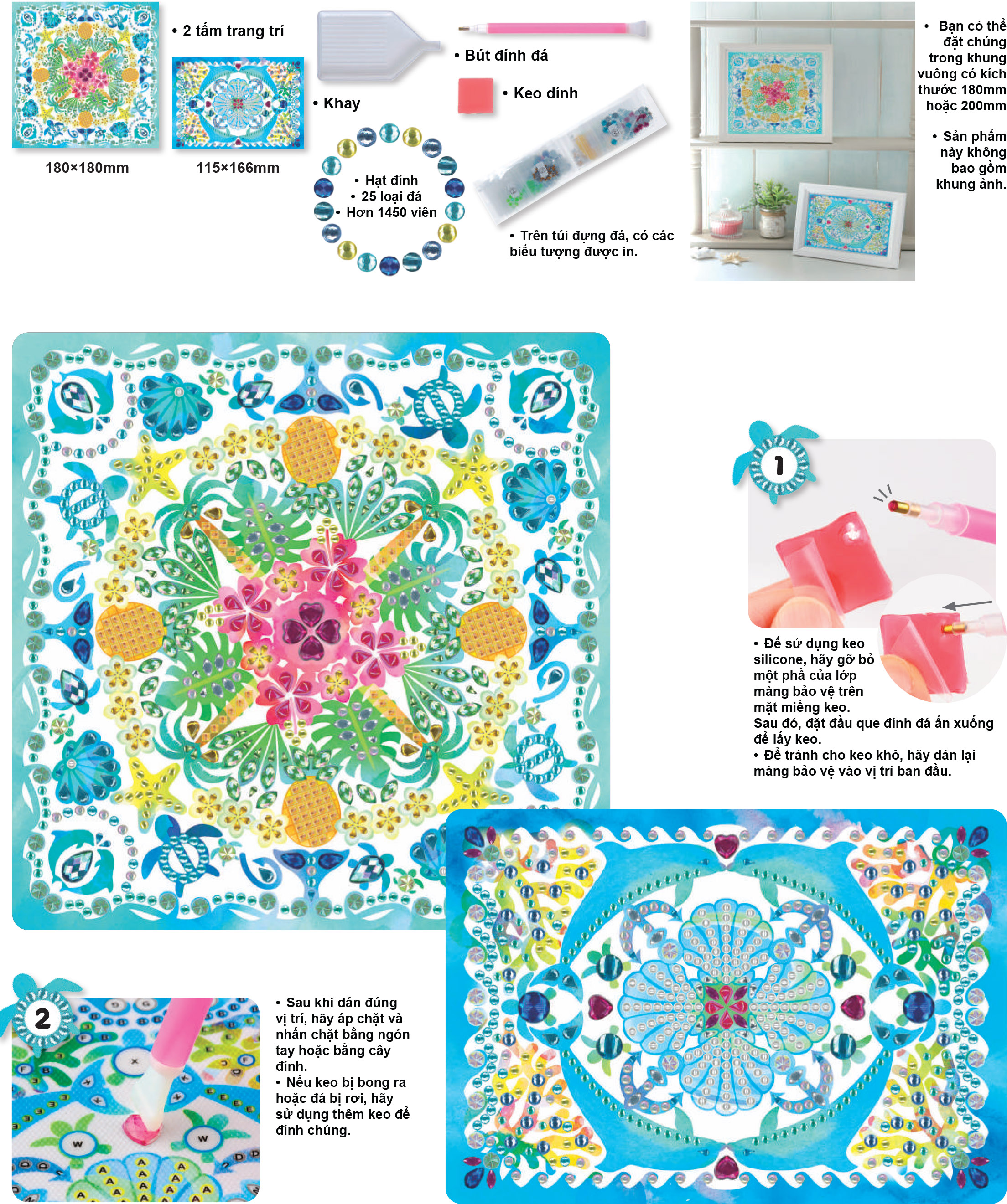 Chất liệu" Nhựa, vải, hạt màu Kích thước gói: 215 15 215 mm Độ tuổi: 15 tuổi trở lên "Đồ chơi thủ công - Tranh đính đá Hawaii" là một tác phẩm nghệ thuật kết hợp phong cách Hawaii, với hình ảnh của những bông hoa tươi đẹp, sinh vật biển và các yếu tố tự nhiên khác từ thiên đường Hawaii. Tương tự như việc khâu từng đường kim một trong việc tạo ra tác phẩm thủ công, việc xếp từng viên đá lấp lánh một cách cẩn thận và đặt hy vọng vào từng viên đá có thể giúp cân bằng và giải phóng khỏi căng thẳng.