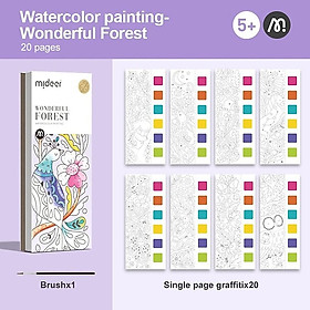 Bộ tô màu nước Mideer gồm 20 tranh, cọ vẽ và mỗi tranh gồm bảng 6 màu kèm theo. Bé chỉ cần chấm nước cọ vẽ và sử dụng bảng màu đi kèm là có thể tha hồ tô vẽ.
